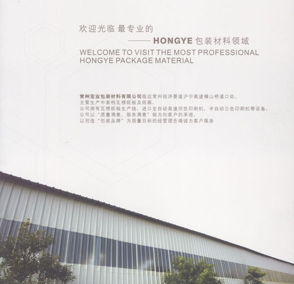 常州宏業(yè)包裝材料有限公司從最初的鮮為人知發(fā)展到現(xiàn)今包裝材料行業(yè)的主流品牌之一。公司生產(chǎn)的包裝材料產(chǎn)品不僅在國內(nèi)已經(jīng)建立了大量的穩(wěn)定的客戶,產(chǎn)品也已遠銷到國外多個國家和地區(qū),深受客戶的好評。 公司臨近常州經(jīng)濟要道滬寧高速橫山道口處,主要生產(chǎn)中高檔瓦楞紙板及紙箱,公司擁有瓦楞紙板生產(chǎn)線、進口全自動高速四色印刷機、半自動三色印刷機等設備,公司以“質(zhì)量滿意,服務滿意”做為向客戶的承諾,以創(chuàng)造“包裝品牌”為質(zhì)量目標的經(jīng)營理念竭誠為客戶服務。 公司已通過ISO9001和1400的認證。 宏業(yè)包裝的商業(yè)信條:宏業(yè)相信自己會成功, 宏業(yè)相信自己所銷售的商品 ,宏業(yè)員工相信自己所在的公司 ,宏業(yè)相信自己的員工和客戶,宏業(yè)相信成功并不是賺取金錢,而是創(chuàng)造信譽,只有好的信譽,成功才會有價值,宏業(yè)相信世界上最美好最偉大的詞就是“自信”,宏業(yè)相信自已每做一次銷售,就交上一個朋友。