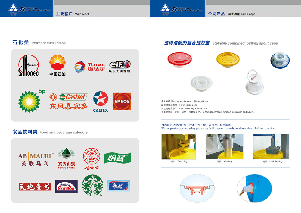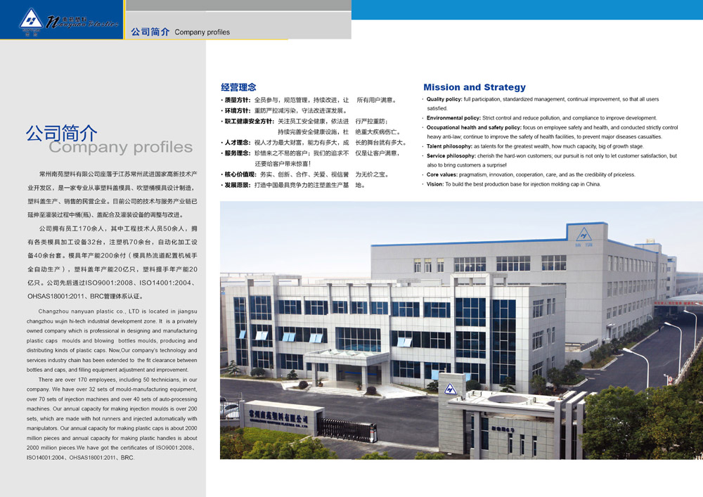 常州南苑塑料有限公司是一家專業(yè)從事塑料蓋模具、吹塑桶模具設(shè)計(jì)制造及塑料蓋產(chǎn)品生產(chǎn)和銷售的民營(yíng)企業(yè)。公司創(chuàng)建于1991年,總投資8000萬元,擁有工程技術(shù)人員50余人,品質(zhì)管理人員20余人;各類注塑設(shè)備70余臺(tái)套。模具加工設(shè)備40余臺(tái)套,模具年產(chǎn)能200余付,塑料蓋年產(chǎn)能20億只,塑料提手年產(chǎn)能20億只。產(chǎn)品涉及潤(rùn)滑油、食品和保健品行業(yè)。主要客戶有:中石化、中石油、道達(dá)爾、埃爾夫、景田、怡寶、農(nóng)夫山泉等知名品牌的生產(chǎn)商!