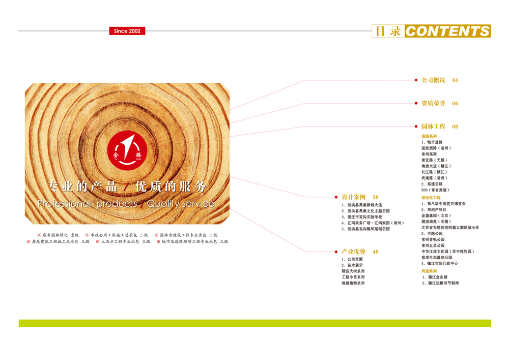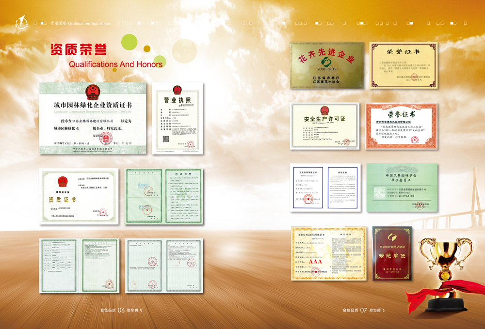 公司以園林綠化工程、市政公用工程、古建筑施工及景觀設(shè)計(jì)為主要業(yè)務(wù)的綜合性公司。并具備園林綠化一級(jí)、市政公用二級(jí)、鋼結(jié)構(gòu)三級(jí)、古建筑三級(jí)、房屋建筑工程施工總承包三級(jí)和城市及道路照明工程專業(yè)承包三級(jí)資質(zhì)企業(yè)。公司組織機(jī)構(gòu)健全、管理制度完善,具備獨(dú)特的經(jīng)營(yíng)理念和服務(wù)精神。公司技術(shù)力量雄厚,機(jī)械設(shè)備齊全。公司已取得AAA級(jí)資信等級(jí)、重合同守信用企業(yè),通過ISO9001國(guó)際認(rèn)證體系并取得證書。目前我公司自主培育苗圃1000余畝,常年生產(chǎn)各種常綠、落葉喬木,花灌木、各類盆景、草坪、地被等植物百余種,年產(chǎn)各類苗木250萬株,盆花130萬盆,暢銷省內(nèi)外各地。