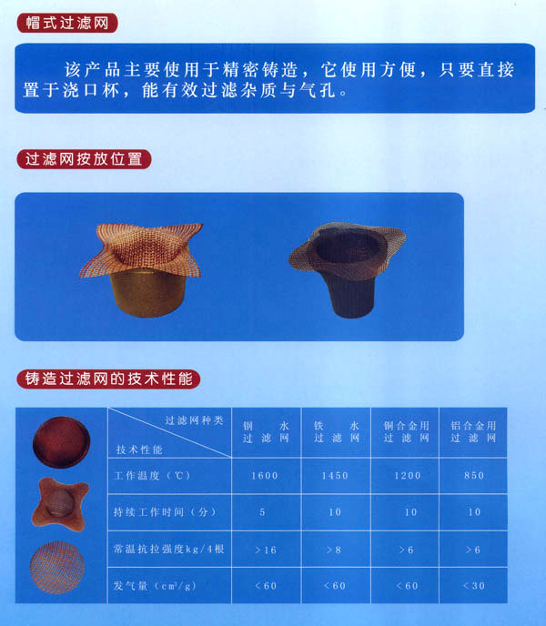 常州市猛將過濾網(wǎng)有限公司是專業(yè)生產(chǎn)系列鑄造過濾網(wǎng)的廠家。主要產(chǎn)品有:鐵水過濾網(wǎng)、鋼水過濾網(wǎng)、銅水過濾網(wǎng)、鋁水過濾網(wǎng)及熔模用帽式過濾網(wǎng)等。本廠產(chǎn)品是哈工大科研成果,榮獲國(guó)家經(jīng)委頒發(fā)的新技術(shù)成果獎(jiǎng)。航天部科技進(jìn)步一等獎(jiǎng);中國(guó)質(zhì)量檢驗(yàn)協(xié)會(huì)授予“猛將”牌高硅氧過濾網(wǎng)“國(guó)家權(quán)威檢測(cè)達(dá)標(biāo)產(chǎn)品”榮譽(yù)證書;我廠生產(chǎn)的“四角帽式過濾網(wǎng)”獲國(guó)家專利局外觀設(shè)計(jì)專利證書;并獲香港國(guó)際新技術(shù)新產(chǎn)品博覽會(huì)“金獎(jiǎng)證書”。2002年獲亞洲國(guó)際新技術(shù)新產(chǎn)品博覽會(huì)“科技發(fā)明進(jìn)步獎(jiǎng)”,2002年本廠所生產(chǎn)的“四角帽式過濾網(wǎng)在首屆“金艦杯”國(guó)際新技術(shù)成果網(wǎng)絡(luò)交易會(huì)活動(dòng)中成績(jī)顯著,被評(píng)為金杯獎(jiǎng)。同年在日內(nèi)瓦國(guó)際專利技術(shù)成果博覽會(huì)中被評(píng)為國(guó)際優(yōu)秀專利金獎(jiǎng)。目前,本廠產(chǎn)品銷往全國(guó)各省、市、自治區(qū),是國(guó)內(nèi)銷量最大的廠家之一。同時(shí)出口韓國(guó)、泰國(guó)、東南亞等國(guó)家。進(jìn)入21世紀(jì)以來,我國(guó)加入WTO后,我廠在哈工大葉榮茂教授的指導(dǎo)下,開發(fā)研制出一種多孔泡沫陶瓷過濾網(wǎng),該產(chǎn)品兼具玻璃纖維過濾網(wǎng)和直孔過濾網(wǎng)的篩分夾渣功能,且更具有吸附微小夾渣氧化物的功能。多孔泡沫陶瓷過濾網(wǎng)的主要工作原理是讓紊亂、翻騰的(TV urbuItnt Flow)金屬液經(jīng)過產(chǎn)品形成平穩(wěn)、均勻(SmoothFlow)的金屬液,金屬液經(jīng)過復(fù)雜的多孔泡沫陶瓷過濾網(wǎng),能有效地吸附截留微小氧化夾渣物,并溢除氣泡,然后能使鑄件產(chǎn)品達(dá)到純潔度高、強(qiáng)度高、韌性好、機(jī)械加工性能好等特點(diǎn),從而能夠降低生產(chǎn)成本,提高產(chǎn)品成品率,增加經(jīng)濟(jì)效益。我廠熱忱歡迎廣大用戶使用該產(chǎn)品。 我公司設(shè)計(jì)發(fā)明的“四角帽式過濾網(wǎng)”,已在2001年3月申請(qǐng)專利,并于當(dāng)年11月底經(jīng)中華人民共和國(guó)知識(shí)產(chǎn)權(quán)局授權(quán)公告。頒布了外觀設(shè)計(jì)專利證書,證書號(hào)第207620號(hào),F(xiàn)有個(gè)別廠家悍然侵權(quán),公然在有關(guān)鑄造媒體打出侵權(quán)產(chǎn)品廣告。對(duì)此,我們鄭重聲明,要求侵權(quán)廠家盡快采取糾正措施,為了維護(hù)我們的知識(shí)產(chǎn)權(quán),我們不排除采取法律行動(dòng)的可能。