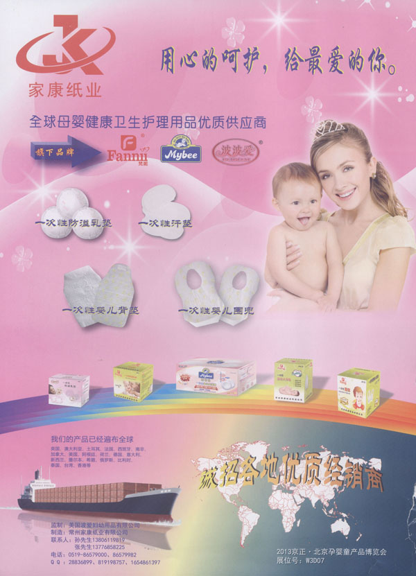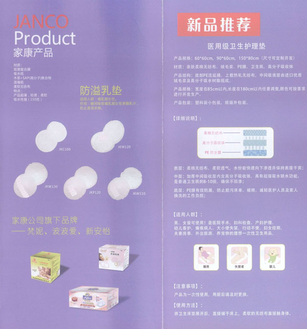 中國(JANCO)家康衛(wèi)生用品公司成立于2004年,我們專注于研發(fā)、設(shè)計、及制造健康的衛(wèi)生用品。我們的產(chǎn)品包括防溢乳墊、汗墊、寶寶背墊、圍兜、護(hù)理墊等。我們的生產(chǎn)廠房建設(shè)在中國江蘇省常州市,這是一個非常美麗的城市,并且我們的廠區(qū)鄰近沿江高速,交通非常便利。 我們擁有國際一流的生產(chǎn)設(shè)備、先進(jìn)的檢測儀器、無菌的生產(chǎn)車間。我們每一個產(chǎn)品都經(jīng)過家康人專心、專業(yè)的制造,我們注重每一個細(xì)節(jié),不斷的研發(fā)更舒適、更健康、更人性化的產(chǎn)品,旨在為您提供更滿意的服務(wù)。我們也可以根據(jù)您的需求研發(fā)、設(shè)計、生產(chǎn)不同的產(chǎn)品。我們的產(chǎn)品已遠(yuǎn)銷海外,并且得到非常好的評價。出口的國家有美國、加拿大、英國、意大利、俄羅斯、南非、泰國等。人性化的設(shè)計、優(yōu)秀的品質(zhì)、完善的售前、售后服務(wù)及合理的價格使我們的客戶與我們的合作感到非常的愉快。 我們已經(jīng)通過了ISO9000和FDA認(rèn)證,我們將感到非常榮幸能夠與您合作。 我們非常樂意與中國的經(jīng)銷商共同分享我們的產(chǎn)品,我們將非常期待您的信任和加盟。 我們將一如既往的為您提供:更舒適的、更健康的產(chǎn)品。