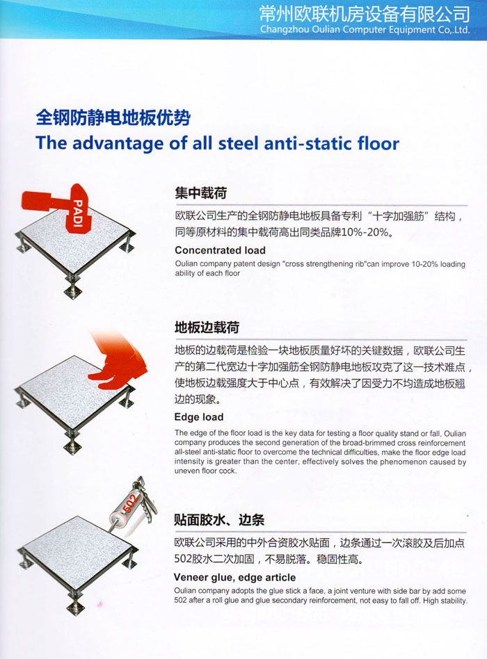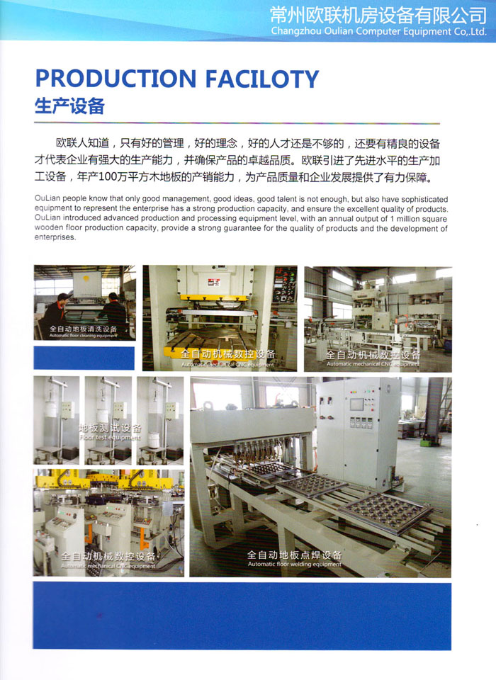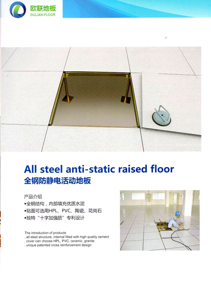 防靜電高架活動(dòng)地板、全鋼地板、陶瓷地板是計(jì)算機(jī)行業(yè)發(fā)展起來的新型鋪地材料,隔離了潮氣、靜電灰塵,最重要的是解決了綜合布線問題,無需預(yù)埋管線,可隨時(shí)拆卸、搬移,保證了資訊設(shè)備完整的優(yōu)點(diǎn),適應(yīng)了智能化樓宇中信息自動(dòng)化技術(shù)對所處環(huán)境的特定要求,避免了廣大客戶的雙重投資,使現(xiàn)代化辦公程度更加高效,辦公場所更加舒適。 “歐聯(lián)”系列全鋼地板,符合國家安全要求,種類完備多樣,其中防靜電陶瓷地板、硫酸鈣地板等除具有普通瓷質(zhì)的裝飾和實(shí)用性外,其耐磨、防水、防火功能優(yōu)于其它同類產(chǎn)品,防靜電系列地板,能切合不同客戶的要求,其靈活的配置,深受客戶歡迎,不同材質(zhì)的地板結(jié)構(gòu)使設(shè)計(jì)師的設(shè)計(jì)空間比傳統(tǒng)的更加廣闊自由和善變。 公司大力發(fā)展國內(nèi)外銷售業(yè)務(wù),多次中標(biāo)國內(nèi)重點(diǎn)工程 ,例:哈爾濱醫(yī)科大學(xué)、山東大學(xué)、上海普通機(jī)場等。 公司將一如既往開發(fā)和制造一流的產(chǎn)品,愿與廣大有識之士合作發(fā)展,共創(chuàng)美好未來。