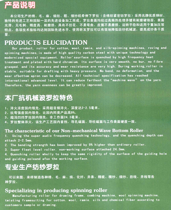 我公司于1998年成立常州進(jìn)熙羅拉廠,經(jīng)過(guò)十年多的經(jīng)營(yíng),于2011年另成立常州聽(tīng)發(fā)機(jī)械配件有限公司,現(xiàn)位于夏城路,靠近湖塘紡織城。 本公司產(chǎn)值從公司成立起從2010年350萬(wàn)逐步提交至2011年的500萬(wàn),2012年有望達(dá)到1000萬(wàn)。主要客戶,河南中原油田,湯姆機(jī)械,上海中行汽保,上海第一紡機(jī)廠,岡熱機(jī)械(常州)。 產(chǎn)品科類(lèi):紡機(jī)配件,抽油桿防磨扶正器,各種精密機(jī)械加工。 技術(shù)能力:本公司有6136數(shù)控7臺(tái),6146數(shù)控1臺(tái),6150數(shù)控1臺(tái),進(jìn)口斜床身1臺(tái),立式加工中心4臺(tái),有專(zhuān)職校車(chē)師傅2名,質(zhì)量巡檢,檢驗(yàn)員各1名。 為了擴(kuò)大生產(chǎn)能力,本公司可能于近年內(nèi)搬遷至更大廠區(qū),尋求更大更高的發(fā)展空間。