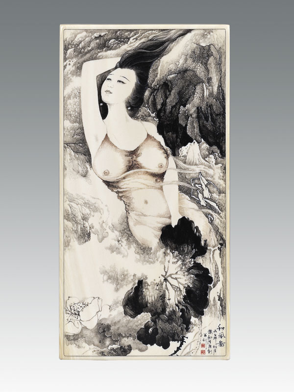 1 牙刻《和風(fēng)圖》是極具創(chuàng)意構(gòu)思新穎的原創(chuàng)作品,水墨雅韻橫生,荷花玉色高潔,仙子和風(fēng)飄逸。作品以花擬人以人喻花,兼工帶寫相應(yīng)成輝,刀法隨意而變,大膽強(qiáng)調(diào)紅與黑的民族審美符號,抒發(fā)作者對美的呼喚、對荷的傾訴。仙子冰雪的肌膚,豐美的體態(tài),洋溢著青春的氣息,散發(fā)出蓬勃的生機(jī)。