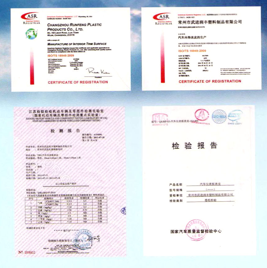 常州市武進(jìn)潤豐塑料制品有限公司地處風(fēng)景美麗經(jīng)濟(jì)發(fā)達(dá)的長江三角洲常州市東郊禮嘉鎮(zhèn),公司占地面積約8000平方米,且地理位置優(yōu)越,是中外客商常涉之地。 本公司專業(yè)生產(chǎn)汽車儀板軟化表皮、PVC門護(hù)板表皮、PVC復(fù)合制品、壓延薄膜制品,(塑料制品除醫(yī)用塑料制品),車輛零部件,機(jī)械電器零部件,電子元件,沖壓件制造,加工無妨制品,玻纖氈(GFP板),麻氈板等。本公司的產(chǎn)品在國內(nèi)一線乘用車上廣泛使用。產(chǎn)品通過國家汽車質(zhì)量監(jiān)督檢驗(yàn)中心檢測,并取得了各種證書,如亞瑟國際認(rèn)證;ISO/TS1694:2009等。 本公司技術(shù)力量雄厚,生產(chǎn)設(shè)備先進(jìn)。多年來,建立了較完善的質(zhì)量管理體系,以先進(jìn)的檢測技術(shù),優(yōu)質(zhì)的服務(wù)態(tài)度,向客戶提供最優(yōu)秀的產(chǎn)品,在同行中享有良好的聲譽(yù)。 歡迎新老客戶來公司指導(dǎo),洽談,合作。