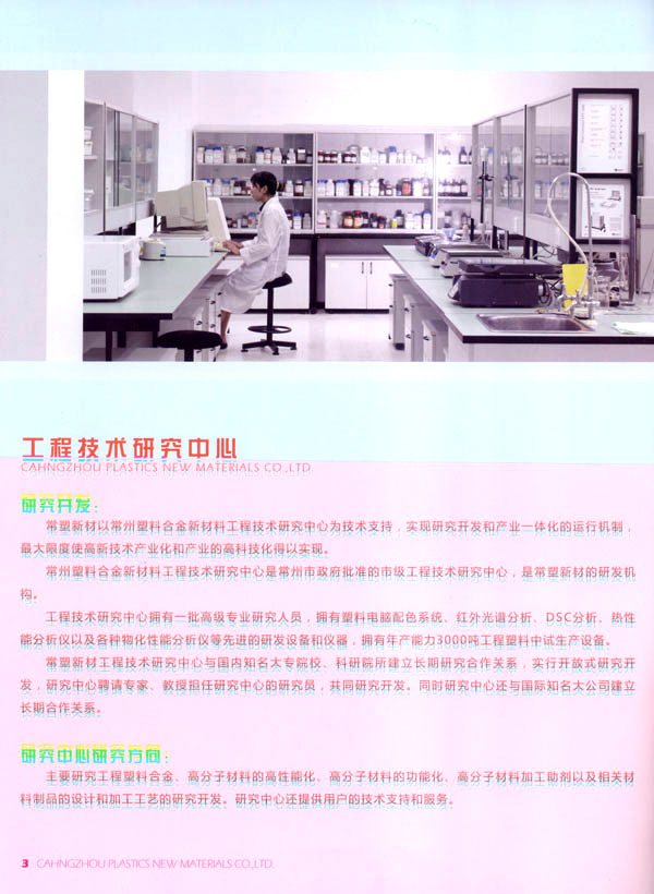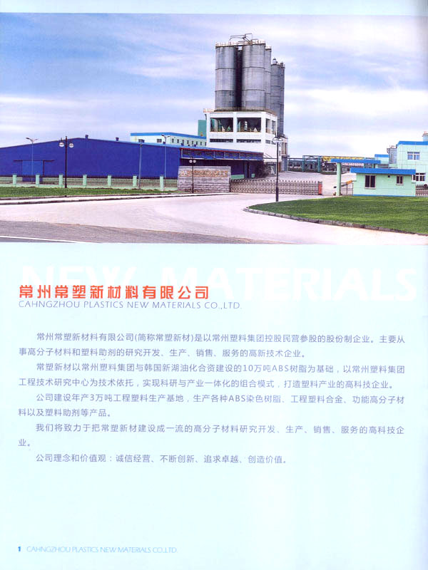 常州常塑新材料有限公司(原名常州塑料集團(tuán)新材料有限公司)是一家民營股份制企業(yè)。主要從事高分子材料和塑料助劑的研究開發(fā)、生產(chǎn)、銷售、服務(wù)。 常塑新材料以常州塑料集團(tuán)與韓國新湖油化合資建設(shè)的10萬噸ABS樹脂為基礎(chǔ),和與德國吉瑪公司合資建設(shè)的20萬噸PET樹脂。以常州塑料集團(tuán)工程技術(shù)研究中心為技術(shù)依托,實現(xiàn)科研與產(chǎn)業(yè)一體化的組合模式。 公司建設(shè)年產(chǎn)3萬噸工程塑料生產(chǎn)基地,生產(chǎn)各種阻燃ABS、耐熱ABS樹脂、工程塑料合金、功能高分子材料以及塑料助劑等產(chǎn)品。 公司目標(biāo):把常塑新材料建設(shè)成一流的高分子材料研究開發(fā)、生產(chǎn)、銷售、服務(wù)的高科技企業(yè)。 公司理念和價值觀:誠信經(jīng)營、不斷創(chuàng)新、追求卓越、創(chuàng)造價值。 公司旨在創(chuàng)造以人為本不斷創(chuàng)新的企業(yè)可持續(xù)發(fā)展的核心競爭力,為社會創(chuàng)造價值。