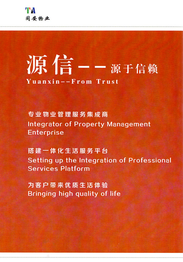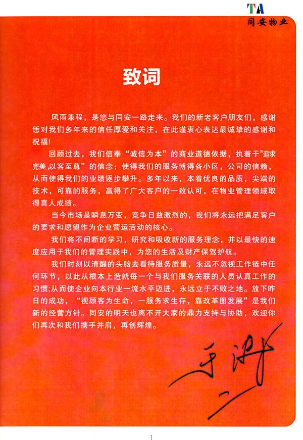 常州市同安物業(yè)管理有限公司注冊1999年,發(fā)展至今已有多年歷史,本公司坐落于美麗的龍城常州,秉承“融聚無限未來”的核心理念,融專業(yè)認(rèn)才,匯優(yōu)質(zhì)資源以”專心,細(xì)心,耐心”的服務(wù)態(tài)度,為客戶打造“安心,順心,稱心”的服務(wù)感受。 公司始終以“打造中國最值得信賴和最值得尊重的物業(yè)管理服務(wù)集成商”為愿景自我鞭策,不斷前行。同安物業(yè)以客戶滿意為終極目標(biāo),不斷加強(qiáng)”崗位資格認(rèn)證能力,人才招聘與職業(yè)化培訓(xùn)能力,產(chǎn)品策劃與管理設(shè)計(jì)能力,品質(zhì)監(jiān)督與管控能力,技術(shù)更新與運(yùn)營優(yōu)化力“五大專業(yè)能力的培養(yǎng)和提升,實(shí)現(xiàn)“精品化管理,專業(yè)化服務(wù)”。 公司發(fā)展至今,員工總數(shù)近千余人,大專以上學(xué)歷200多人,中高級技術(shù)人員160人,維修人員140人,物業(yè)管理師80名,公司接管面積達(dá)3100000多平方米,設(shè)涉及住宅小區(qū),別墅,大型游樂場,公園,醫(yī)院,廠區(qū),商業(yè)等。公司的工作管理逐步導(dǎo)入ISO9001質(zhì)量體系和ISO4001環(huán)境管理體系和GB/T28001職業(yè)健康安全管理體系,嚴(yán)格按照質(zhì)量體系的標(biāo)準(zhǔn)執(zhí)行。