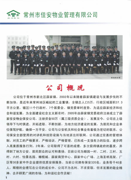佳安物業(yè)管理有限公司位于常州市新北區(qū)薛家鎮(zhèn),2005年由薛家鎮(zhèn)黨委政府注冊(cè)成立,注冊(cè)資金50萬(wàn)元,屬于三級(jí)資質(zhì)企業(yè)。成立之初,佳安物業(yè)作為政屬事業(yè)單位,主要負(fù)責(zé)管理薛家鎮(zhèn)順園新村安置小區(qū)。隨著薛家鎮(zhèn)經(jīng)濟(jì)和人口的發(fā)展,為主動(dòng)適應(yīng)經(jīng)濟(jì)發(fā)展新常態(tài),全面深化物業(yè)綜合改革,打造具有薛家特色的物業(yè)公司,佳安物業(yè)由政府下屬的事業(yè)單位正式轉(zhuǎn)變?yōu)楠?dú)立運(yùn)營(yíng)的企業(yè),并增資到1000萬(wàn)元。 2017年6月,公司通過(guò)審核被評(píng)為“AAA”級(jí)信用企業(yè),同月,公司實(shí)施ISO9001質(zhì)量管理體系標(biāo)準(zhǔn),并于8月通過(guò)質(zhì)量體系認(rèn)證審核。2018年8月,公司通過(guò)了ISO14001環(huán)境管理體系、ohsas18001職業(yè)健康安全管理體系的認(rèn)證審核。 目前,公司主要承接小區(qū)物業(yè)服務(wù)及廠(chǎng)區(qū)外派保安服務(wù)、保潔服務(wù)等,F(xiàn)公司為薛家鎮(zhèn)順園一村至順園九村安置小區(qū)及奧林匹克花園、怡景名園2處商業(yè)小區(qū)提供物業(yè)服務(wù);為江南農(nóng)村商業(yè)銀行新北區(qū)所有支行、中車(chē)鐵馬、投資服務(wù)中心、華夏藝博園、薛家幼兒園、薛家小學(xué)及薛家中學(xué)等單位提供外派保安服務(wù);為薛家鎮(zhèn)中心廣場(chǎng)及松林別墅提供保安服務(wù);為華夏藝博園及投資服務(wù)中心提供保潔服務(wù)等。 在這十余年中,佳安物業(yè)與時(shí)俱進(jìn),銳意進(jìn)取,為地方建設(shè)發(fā)展注入動(dòng)力,為居民和企業(yè)安全保駕護(hù)航,尤其是在實(shí)踐中,我們積極探索,正逐步摸索出一條適合薛家城鄉(xiāng)一體化建設(shè)的社區(qū)物業(yè)管理的新路。希望通過(guò)今天的分享,和大家一起探討我們?cè)凇肮苻k分離”等方面的實(shí)踐經(jīng)驗(yàn),并在此基礎(chǔ)上為薛家的可持續(xù)發(fā)展提供可借鑒、推廣的新型物業(yè)管理之路。