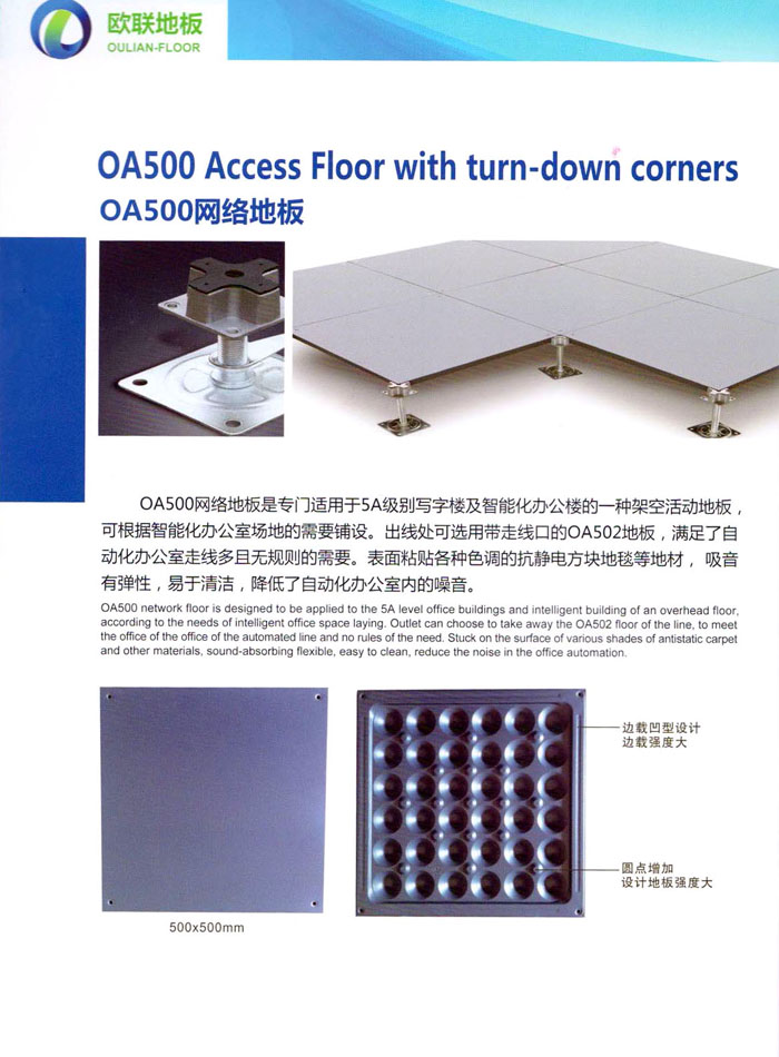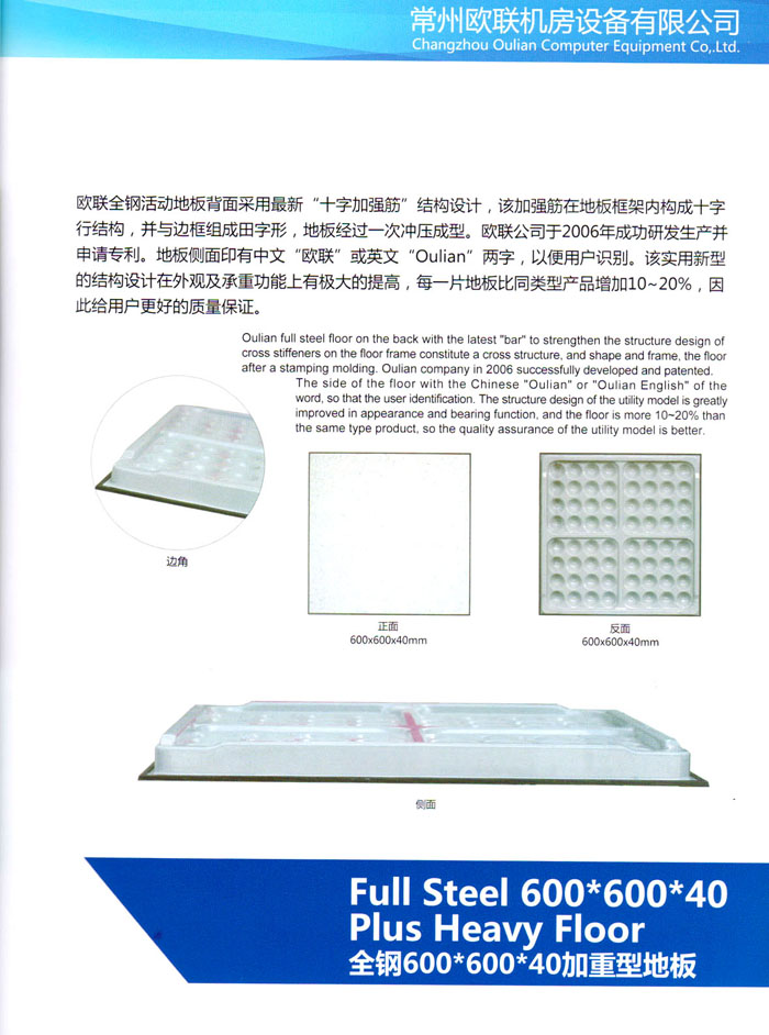 防靜電高架活動地板、全鋼地板、陶瓷地板是計算機行業(yè)發(fā)展起來的新型鋪地材料,隔離了潮氣、靜電灰塵,最重要的是解決了綜合布線問題,無需預(yù)埋管線,可隨時拆卸、搬移,保證了資訊設(shè)備完整的優(yōu)點,適應(yīng)了智能化樓宇中信息自動化技術(shù)對所處環(huán)境的特定要求,避免了廣大客戶的雙重投資,使現(xiàn)代化辦公程度更加高效,辦公場所更加舒適。 “歐聯(lián)”系列全鋼地板,符合國家安全要求,種類完備多樣,其中防靜電陶瓷地板、硫酸鈣地板等除具有普通瓷質(zhì)的裝飾和實用性外,其耐磨、防水、防火功能優(yōu)于其它同類產(chǎn)品,防靜電系列地板,能切合不同客戶的要求,其靈活的配置,深受客戶歡迎,不同材質(zhì)的地板結(jié)構(gòu)使設(shè)計師的設(shè)計空間比傳統(tǒng)的更加廣闊自由和善變。 公司大力發(fā)展國內(nèi)外銷售業(yè)務(wù),多次中標國內(nèi)重點工程 ,例:哈爾濱醫(yī)科大學(xué)、山東大學(xué)、上海普通機場等。 公司將一如既往開發(fā)和制造一流的產(chǎn)品,愿與廣大有識之士合作發(fā)展,共創(chuàng)美好未來。