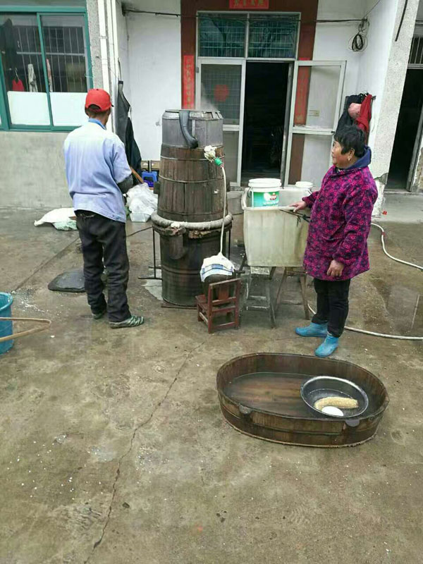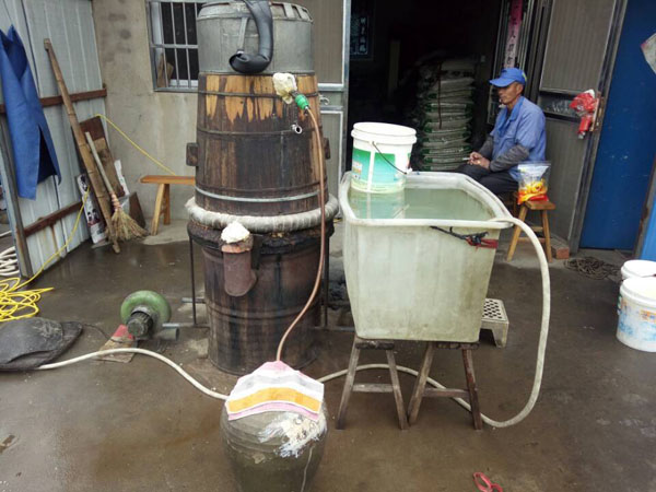 第四步:放入缸中,酒曲和糯米拌好后,便可放入屋內的大缸中,并在其中挖出個圓形的洞,放入竹筒做酒窩。在此之前,大缸可用之前冷卻糯米飯的溫水擦一擦暖缸,這樣更有益于酒曲發(fā)酵。為了保證酒曲發(fā)酵的溫度,還要給酒料附上塑料薄膜。若是氣溫低于零度,還得多蓋上幾層棉被才行。像池阿姨家的400斤糯米,老徐至少要重復這些步驟八遍!大缸中的酒料大約發(fā)酵了10天左右,在酒乳已非常豐富之際,按照1:1的比例,打開封口加入冷開水,然后再蓋上棉被。繼續(xù)放置45天后,米酒才算大功告成!如果覺得米酒不過癮,老徐還會將米酒吊成燒酒,也就是白酒,依舊是傳統(tǒng)的老手藝。未來某天,TA會消失 ,其實,做米酒的方法并不難,幾乎是以前家家戶戶的必備技能。然而現如今,不僅老常州們不再自己做酒,就連像老徐這樣的做米酒手藝人也越來越少。就連跟了老徐三十多年的一套米酒家當,也同樣經不起歲月:鐵鍋漏了要去找橫山橋的老師傅;木桶壞了要去禮嘉修;爐子也有專門的式樣,過幾年就要拿著圖紙找人翻新......