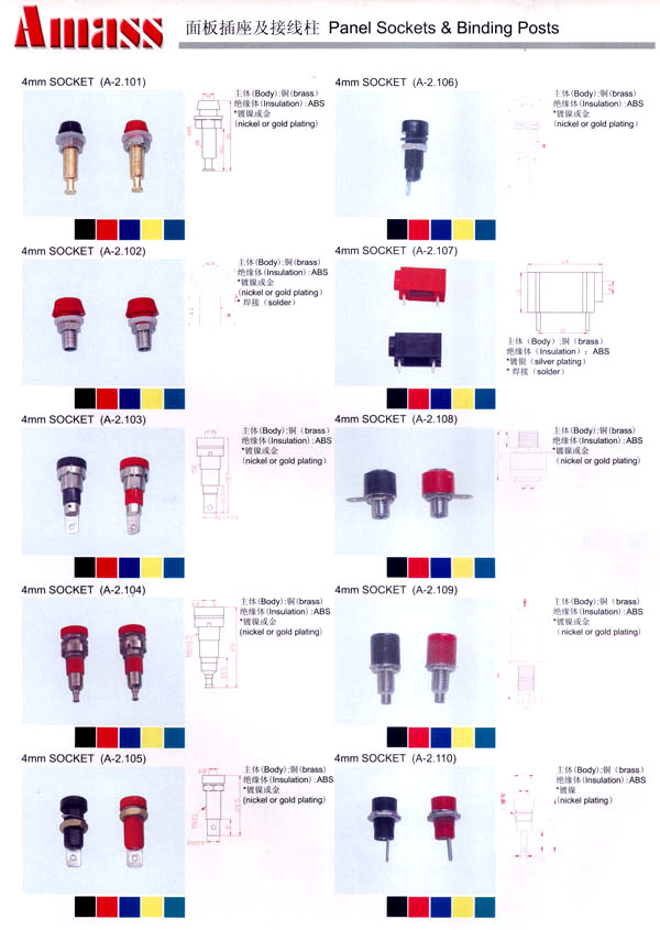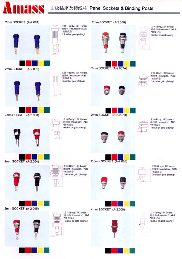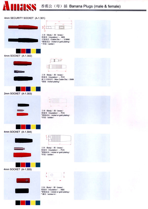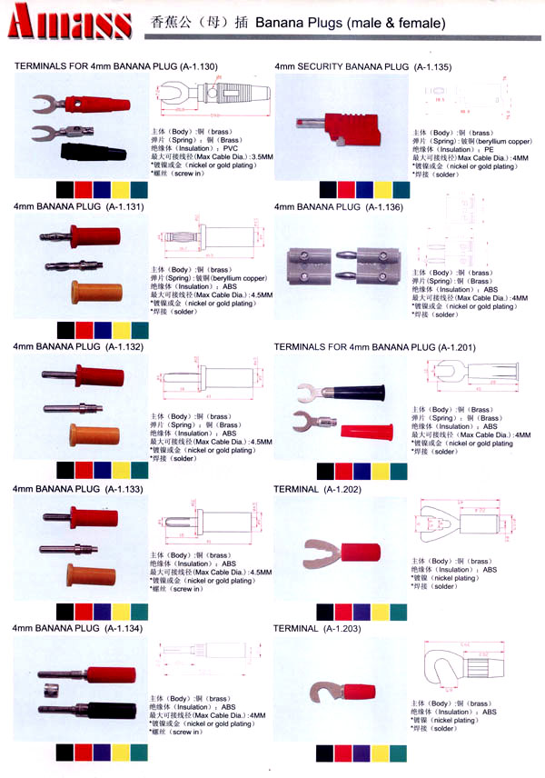 本公司專業(yè)生產(chǎn)各類香蕉插頭,香蕉插座,接線柱,電瓶夾,鱷魚夾,測試導線,測試筆等。產(chǎn)品分2mm/2.5mm/3mm/3.5mm/4mm五大系列,百余種款式, 各種香蕉插廣泛用于儀器、儀表、電力測試、教學、玩具,視聽設備、醫(yī)療儀器,保健產(chǎn)品等領域。公司技術力量雄厚,生產(chǎn)工藝先進,產(chǎn)品遠銷港、臺、歐美,并與飛利浦等國際品牌配套。公司本著精益求精的理念,歡迎新老客戶光臨。 我們擁有資深的工程師和豐富的電子產(chǎn)品銷售經(jīng)驗,專業(yè)生產(chǎn)各類電子接插件產(chǎn)品。 香蕉插頭,香蕉插座,電瓶夾,鱷魚夾等品種齊全、 質(zhì)量可靠,致力服務于通訊、數(shù)據(jù)通信、消費類電子產(chǎn)品、計算機和計算機外圍設備以及工業(yè)應用等領域,能給客戶提供全面采購解決方案。 我們秉承穩(wěn)健作風、誠實經(jīng)營、合理價格、完善服務的宗旨,在全體客戶的支持下,公司不斷創(chuàng)新進取,業(yè)績蒸蒸日上,已與數(shù)十家電子零件制造商及其分支機構(gòu)建立密切合作關系,在國內(nèi)擁有數(shù)百家固定客戶。