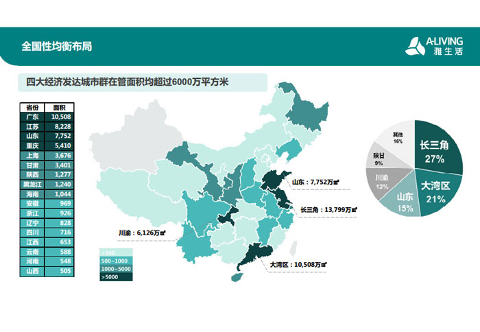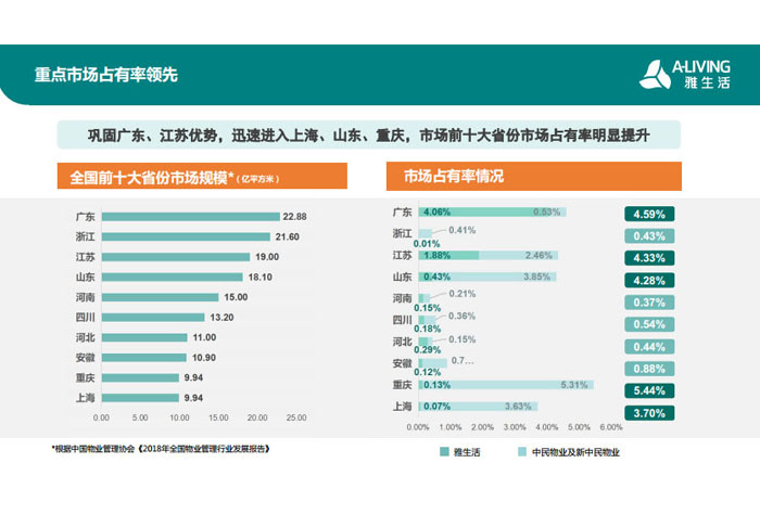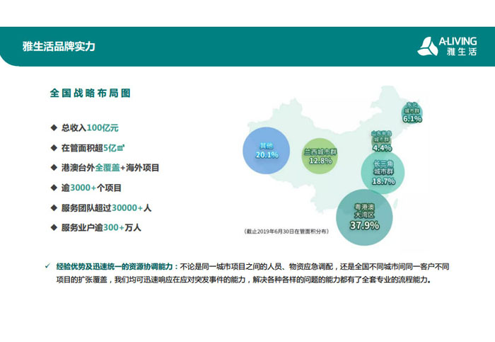 一、立足北上廣,面向全中國,走向全世界 1992年,雅居樂物業(yè)開篇中山,率先引入港式物業(yè)管理模式。1997年,依托雅居樂地產(chǎn)的崛起,連續(xù)接管中山多個(gè)項(xiàng)目,成為高端大盤物業(yè)管理的領(lǐng)跑者。1999年,雅居樂物業(yè)開啟專業(yè)化發(fā)展模式,全面通過英國皇家BSI的ISO9000質(zhì)量管理體系認(rèn)證,2001年成為國家首批一級物業(yè)管理資質(zhì)企業(yè)。 2002年,隨著廣州雅居樂花園的盛大啟幕,雅居樂物業(yè)邁開向廣州進(jìn)軍的步伐。為尋求更長遠(yuǎn)的發(fā)展,雅居樂積極構(gòu)思上市藍(lán)圖,2005年在香港成功上市。在深耕珠三角城市群的同時(shí),2006年雅居樂物業(yè)揮師北上,正式開啟全國部署戰(zhàn)略。2008年,接管海南清水灣項(xiàng)目,揭開旅游地產(chǎn)物業(yè)管理的新篇章。 接下來近十年里,雅居樂物業(yè)始終保持著最年輕的成長姿態(tài),依托“管理數(shù)字化、服務(wù)專業(yè)化、流程標(biāo)準(zhǔn)化和操作機(jī)械化”的發(fā)展戰(zhàn)略,雅居樂物業(yè)榮膺2018中國物業(yè)服務(wù)百強(qiáng)企業(yè)第11名,2018年中國物業(yè)服務(wù)百強(qiáng)企業(yè)成長性第二名、2018年中國物業(yè)服務(wù)百強(qiáng)服務(wù)質(zhì)量領(lǐng)先企業(yè)、2018年中國物業(yè)服務(wù)百強(qiáng)滿意度領(lǐng)先企業(yè)、2018中國物業(yè)服務(wù)百強(qiáng)經(jīng)營績效領(lǐng)先企業(yè)、旅游地產(chǎn)物業(yè)管理領(lǐng)先品牌、2018年中國辦公物業(yè)管理優(yōu)秀企業(yè)(綠地物業(yè))、2017中國物業(yè)管理企業(yè)品牌價(jià)值第12名、2017中國物業(yè)管理企業(yè)綜合實(shí)力第12名、中國藍(lán)籌物業(yè)企業(yè)、《旅游地產(chǎn)物業(yè)管理服務(wù)標(biāo)準(zhǔn)》(團(tuán)體標(biāo)準(zhǔn))起草工作等多項(xiàng)殊榮。 目前,雅生活集團(tuán)已形成廣州、中山、深圳、南京、上海、西安、成都、海南、云南、北京、鄭州、南寧、沈陽、武漢、馬來西亞十五大城市公司全面發(fā)展的蓬勃態(tài)勢。截止2017年12月31日,雅生活集團(tuán)管理范圍覆蓋全國逾69座城市與地區(qū),服務(wù)類型涵蓋主流住宅、高端豪宅、旅游地產(chǎn)、商業(yè)、寫字樓等多種業(yè)態(tài),合約總建筑面積為12610萬平方米,擁有200多個(gè)項(xiàng)目,服務(wù)業(yè)主逾100萬人。 2017年6月,雅生活集團(tuán)收購綠地物業(yè)100%股權(quán),并與綠地集團(tuán)簽署戰(zhàn)略合作協(xié)議,8月,綠地集團(tuán)投資10億元獲得雅生活集團(tuán)20%股權(quán)。未來,雅生活集團(tuán)將實(shí)施“雅居樂物業(yè)”與“綠地物業(yè)”雙品牌驅(qū)動戰(zhàn)略,還將尋求在A股上市,力爭打造中國物業(yè)“A+H”第一股。