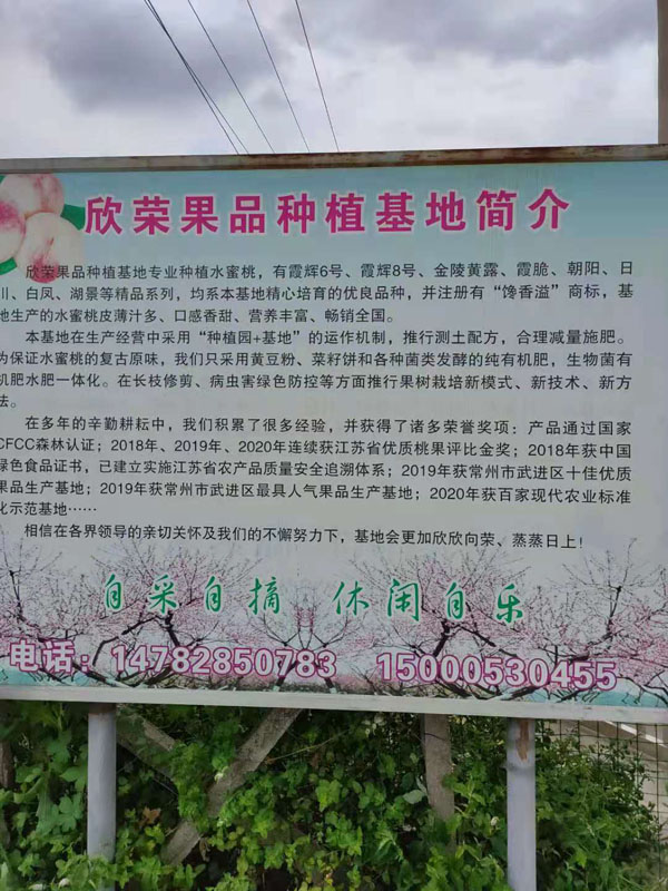 欣榮果品種植基地專業(yè)種植水蜜桃,有霞輝6號、霞輝8號、金陵黃露、霞脆、朝陽、日川、自鳳、湖景等精品系列,均系本基地精心培育的優(yōu)良品種,并注冊有“饞香溢”商標(biāo),基地也生產(chǎn)的水蜜桃皮薄汁多、口感香甜、營養(yǎng)豐富、暢銷全國。 本基地在生產(chǎn)經(jīng)營中采用“種植園+基地”的運作機制,推行測土配方,合理減量施肥。保證水蜜桃的復(fù)古原昧。我們只采用黃豆粉、菜籽餅和各種菌類發(fā)酵的純有機肥,生物菌有機肥水肥一體化。在長枝修剪、病蟲害綠色防控等方面推行果樹栽培新模式、新技術(shù)、新方去。 在多年的辛勤耕耘中,我們積累了很多經(jīng)驗,并獲得了諸多榮譽獎項:產(chǎn)品通過國家CFCC森林認(rèn)證;2018年、2019年、2020年連續(xù)獲江蘇省優(yōu)質(zhì)桃果評比金獎;2018年獲中國綠色食品證書,已建立實施江蘇省農(nóng)產(chǎn)品質(zhì)量安全追溯體系;2019年獲常州市武進(jìn)區(qū)十佳優(yōu)質(zhì)果品生產(chǎn)基地;2019年獲常州市武進(jìn)區(qū)最具人氣果品生產(chǎn)基地;2020年獲百家現(xiàn)代農(nóng)業(yè)標(biāo)準(zhǔn)化示范基地…… 相信在各界領(lǐng)導(dǎo)的親切關(guān)懷及我們的不懈努力下,基地會更加欣欣向榮、蒸蒸日上!
