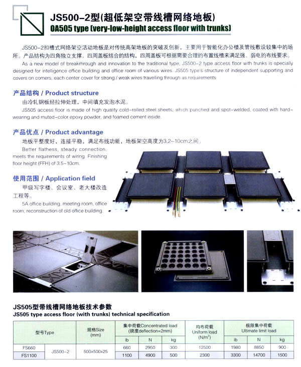 公司生產(chǎn)防靜電鋼質(zhì)、木質(zhì)機(jī)房地板和強(qiáng)化復(fù)合地板及各種電腦操作臺(tái)系列產(chǎn)品。該產(chǎn)品廣泛應(yīng)用于電子機(jī)房、通訊機(jī)房、各類(lèi)實(shí)驗(yàn)室和管線鋪設(shè)集中的防靜電場(chǎng)所以及家庭、大型商場(chǎng)的裝飾。公司技術(shù)力量雄厚、管理科學(xué),已具有設(shè)計(jì)、開(kāi)發(fā)、市場(chǎng)營(yíng)銷(xiāo)及售后服務(wù)的專(zhuān)業(yè)人才隊(duì)伍。