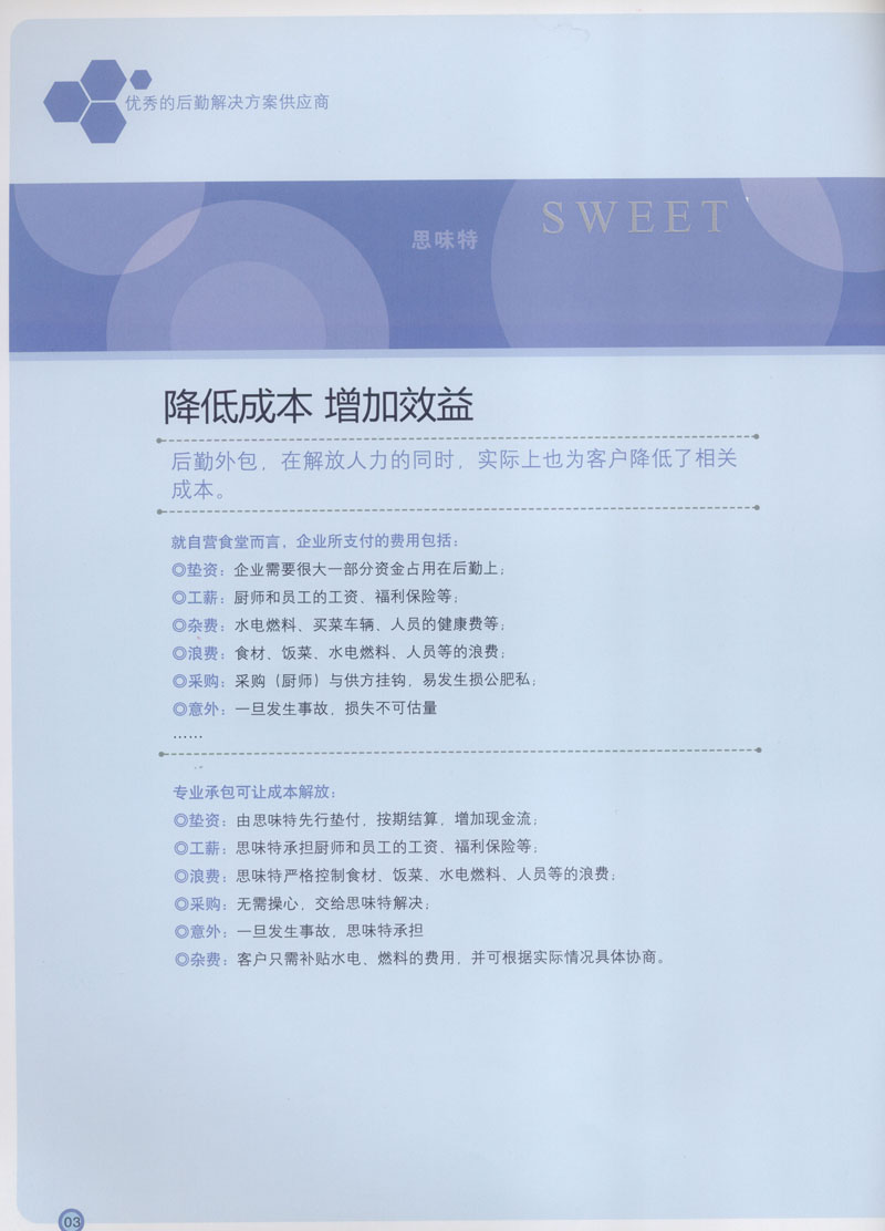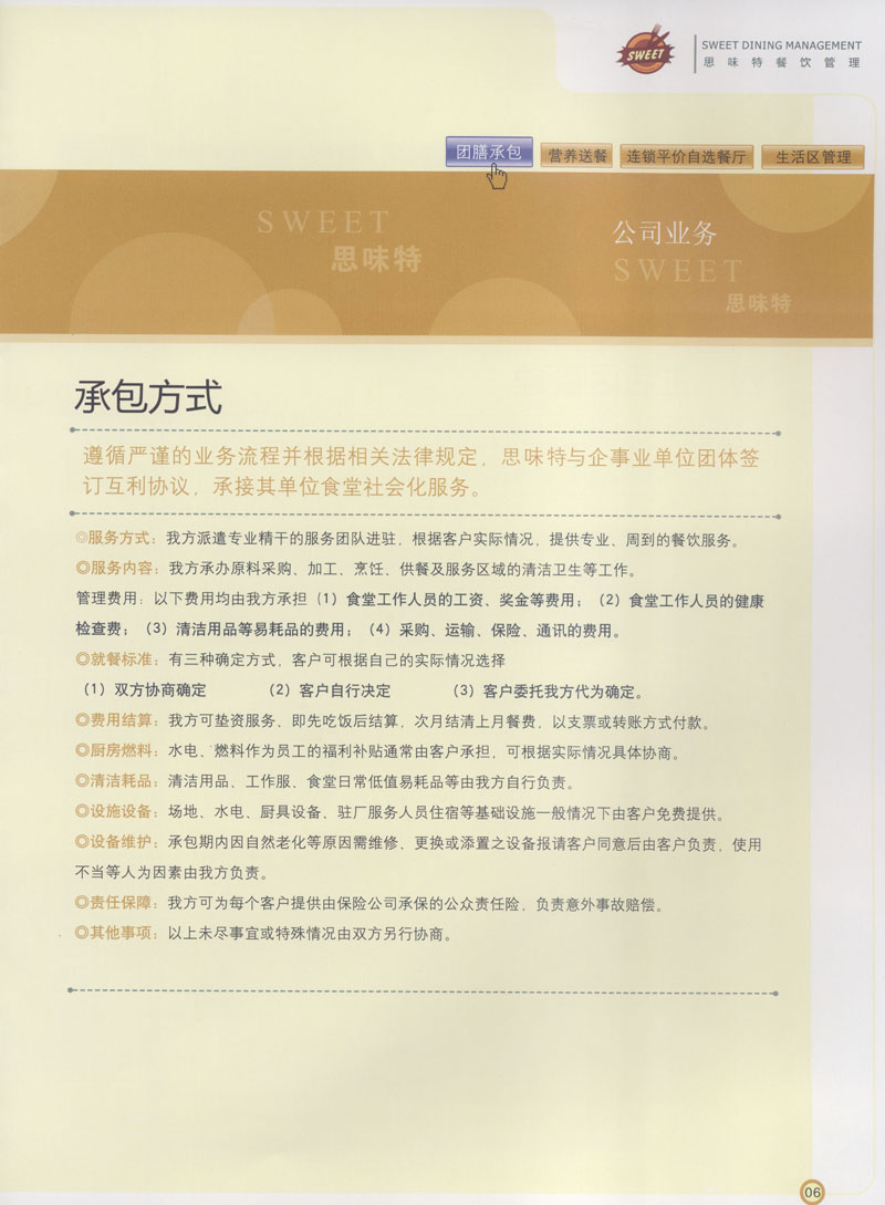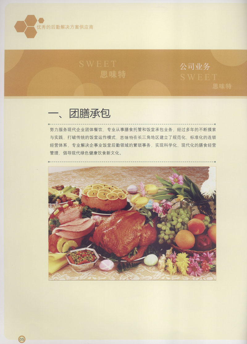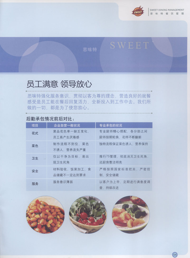 常州市思味特餐飲有限公司是一家專業(yè)從事企事業(yè)后勤服務的有限責任公司,公司從承包食堂起步,逐漸發(fā)展為經(jīng)營團膳承包、營養(yǎng)送餐、生活區(qū)管理、連鎖餐廳的綜合型企業(yè)。2008年公司斥資100萬元,在常州興建了可以同時提供3000餐膳食的中央廚房,重點打造“和美客”后勤服務品牌,全力為企事業(yè)單位解決后勤后顧之憂。 到目前為止,我們合作成功的企事業(yè)單位超過50多家,服務人數(shù)突破15萬,合作單位包括國家機關、國有企業(yè)、三資企業(yè)、民營企業(yè)、學校、醫(yī)院等,其中不乏國際知名品牌公司。 和美客愿為更多的國內外企事業(yè)單位及機關團體分憂解難,從廚房設計、菜品配送、團膳承包、到生活區(qū)管理等提供全方位的服務。