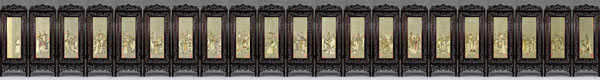 4 牙刻《三國(guó)演義圖》,作者懷著對(duì)牙刻藝術(shù)的鐘愛(ài),對(duì)中華古老文化之敬仰,肩負(fù)時(shí)代之重托,賦予作者堅(jiān)韌不撥的決心和毅力。牙刻《三國(guó)演義》創(chuàng)作靈感被點(diǎn)燃,博大、深遂、精致而具有鮮明文化特質(zhì)的牙刻作品自然天成,得以成就夢(mèng)寐以求的作品。由微雕63萬(wàn)余漢字《三國(guó)演義》全文作為灰色背景,105枚金石名章烘托出《三國(guó)演義》名著中各領(lǐng)風(fēng)騷、形象鮮明的126個(gè)主要人物。由21扇牙刻紫檀組合成3.28米長(zhǎng)的巨型屏風(fēng),寓意著對(duì)美好21世紀(jì)的憧憬。小牙刻大題材、大系列、大氣魄、大氣象,最終產(chǎn)生巨大的震撼力。牙刻《三國(guó)演義》如此恢弘絕無(wú)僅有、前無(wú)古人。從表象看牙刻與微雕的融合、書(shū)法金石與人物的呼應(yīng)、灰色背景與墨彩的烘托,精雕紫檀與微雕牙刻的對(duì)照,而深層次看這些都是繪畫語(yǔ)言在牙刻藝術(shù)中的完美體現(xiàn),也突破了千余年來(lái)固守線刻傳統(tǒng)的窠臼,提升了當(dāng)今牙刻藝術(shù)的品位并注入新的活力,將牙刻從藝人勞動(dòng)升華為藝術(shù)家從事的創(chuàng)作。這件作品是我歷時(shí)五年于2001年10月雕刻而成,一經(jīng)展出引起了工藝美術(shù)界高度關(guān)注,獲得了首屆中國(guó)華東工藝美術(shù)精品展金獎(jiǎng)、第三屆國(guó)家級(jí)工藝美術(shù)大師精品展金獎(jiǎng)、首屆中國(guó)工藝美術(shù)學(xué)會(huì)最高學(xué)術(shù)獎(jiǎng)“華藝杯”金獎(jiǎng)。