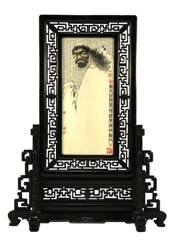 2牙刻《回眸》傳神的刻畫了達(dá)摩禪師回眸間投來(lái)的眼神,就像一位飽經(jīng)風(fēng)霜的老者,有幾經(jīng)坎坷的人生故事向你訴說(shuō),有多少世態(tài)炎涼人生哲理向你傳遞;仨g風(fēng)中飄逸的須發(fā)、寬聳的鼻梁、緊鎖的眉頭,乃至畫面中作者極力奉獻(xiàn)給觀者的、達(dá)摩那炯炯有神的眼睛,像大海那么寬廣、像宇宙那么深遂。畫面背景銘刻達(dá)摩相關(guān)禪的精辟論著,更顯佛的天國(guó),禪的意境。幾枚大小相間的朱紅印章散發(fā)幾分文雅氣息。人物的須發(fā)看似瀟灑的筆墨一揮而就,其實(shí)借助放大鏡看去烏黑發(fā)亮、密密層層的須發(fā)根根可數(shù)、飄逸迷人。既突出筆墨與刀法,又凸顯內(nèi)涵與精神,是作者勤于雕刻而又修煉于雕刻之外的結(jié)晶。 此作獲首屆中國(guó)華東工藝美術(shù)精品展特等金獎(jiǎng),為中國(guó)工藝美術(shù)館珍藏。
