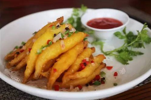 椒鹽大銀魚 從張總口中得知,原來太湖銀魚約有4種,眼前這道菜選用的就是個(gè)頭最大的銀魚,也叫柴魚。只是簡單地裹了面粉下鍋油炸,撒上點(diǎn)自配椒鹽料,酸甜汁作輔。盤中堆成“金色小山”看著美,聞著香,吃著鮮。區(qū)別于上一道菜,對(duì)這盤銀魚你大可放開了吃,一口一個(gè),體驗(yàn)脆香表皮中肥美的滋味在口中迸發(fā),絕對(duì)是極致的享受。
