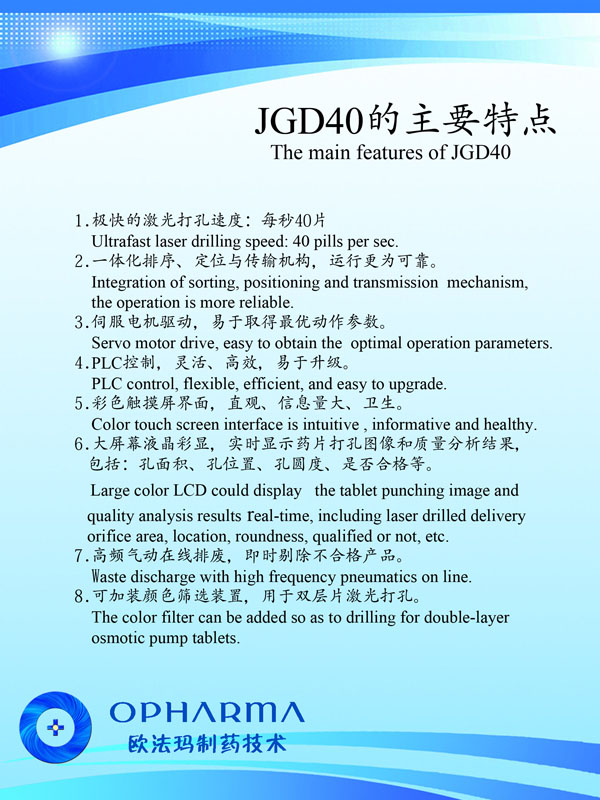 常州歐法瑪制藥技術(shù)有限公司位于長江三角洲黃金腹地——常州。地理位置優(yōu)越、交通便捷,由鐵路、公路、水路、民航形成了一張立體交叉的交通網(wǎng)絡。 公司創(chuàng)建于2013年,是一家集研發(fā)、生產(chǎn)和銷售為一體,專業(yè)從事高速激光打孔機、滲透泵制劑研發(fā)、生產(chǎn)和銷售。目前公司擁有員工20人,科技研發(fā)和技術(shù)人員占員工總數(shù)80%以上,其中本科以上學歷占80%以上。 公司始建以來,以前瞻的科學規(guī)劃,通過自主研發(fā),解決了高速激光打孔機諸多的世界難題,使之達到40片/秒以上且精確打孔的國際領(lǐng)先水平;同時開發(fā)廢片自動識別、剔除功能,以滿足客戶的實際所需。公司與瑞士等國家研究機構(gòu)的科技合作,以高速激光打孔機為基礎(chǔ),建設了滲透泵制劑研發(fā)和中試生產(chǎn)車間,開發(fā)了多種藥物的滲透泵制劑,形成了從關(guān)鍵設備研制,新制劑開發(fā)、工藝配套,到批量生產(chǎn)測試的滲透泵制劑開發(fā)全過程技術(shù)團隊和研究設施。公司瞄準現(xiàn)代新型釋藥系統(tǒng),吸收國內(nèi)外高端人才,努力開拓控緩釋技術(shù)、靶向給藥技術(shù)及智能給藥技術(shù)。 2013年公司被評為黑馬大賽“創(chuàng)業(yè)組50強”、“領(lǐng)軍人才創(chuàng)業(yè)重點企業(yè)”;2014公司通過了IS09001-2008質(zhì)量管理體系認證、CE認證、江蘇省質(zhì)量信得過企業(yè)。