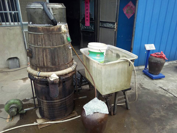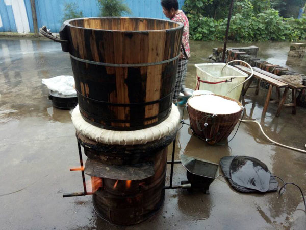 第四步:放入缸中,酒曲和糯米拌好后,便可放入屋內(nèi)的大缸中,并在其中挖出個(gè)圓形的洞,放入竹筒做酒窩。在此之前,大缸可用之前冷卻糯米飯的溫水擦一擦暖缸,這樣更有益于酒曲發(fā)酵。為了保證酒曲發(fā)酵的溫度,還要給酒料附上塑料薄膜。若是氣溫低于零度,還得多蓋上幾層棉被才行。像池阿姨家的400斤糯米,老徐至少要重復(fù)這些步驟八遍!大缸中的酒料大約發(fā)酵了10天左右,在酒乳已非常豐富之際,按照1:1的比例,打開(kāi)封口加入冷開(kāi)水,然后再蓋上棉被。繼續(xù)放置45天后,米酒才算大功告成!如果覺(jué)得米酒不過(guò)癮,老徐還會(huì)將米酒吊成燒酒,也就是白酒,依舊是傳統(tǒng)的老手藝。未來(lái)某天,TA會(huì)消失 ,其實(shí),做米酒的方法并不難,幾乎是以前家家戶(hù)戶(hù)的必備技能。然而現(xiàn)如今,不僅老常州們不再自己做酒,就連像老徐這樣的做米酒手藝人也越來(lái)越少。就連跟了老徐三十多年的一套米酒家當(dāng),也同樣經(jīng)不起歲月:鐵鍋漏了要去找橫山橋的老師傅;木桶壞了要去禮嘉修;爐子也有專(zhuān)門(mén)的式樣,過(guò)幾年就要拿著圖紙找人翻新......