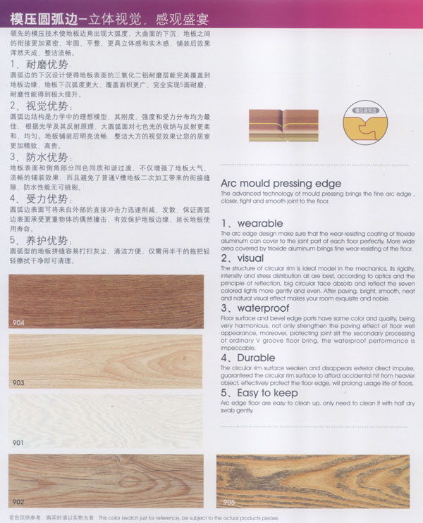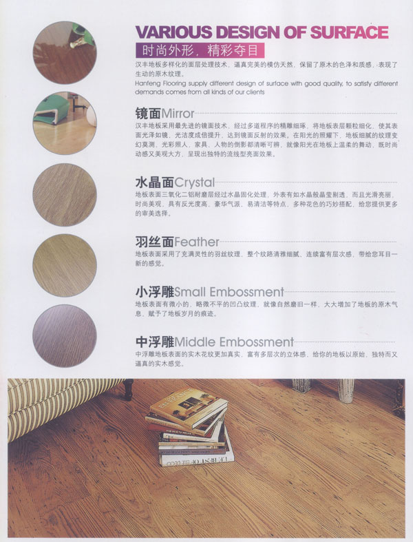 常州漢豐裝飾材料有限公司是一家涉及強化地板制造、屏風鋁材生產、進出口貿易的大型公司。2001年公司投入重資.全面引進世界頂級一體化自動流水生產線和具有國際先進水準的德國權威木地板生產技術,興建強化地板生產基地。多年以來.一直不斷加強生產設備、廠房基礎投入,目前公司年生產強化地板能力已經達到了500萬平方米,步入國內一流行列,具備了雄厚的國際競爭力。 漢豐地板以奉獻生活中最完美的地板為發(fā)展目標,時尚流行的設計風格和多樣化的產品類型,贏得了市場的廣泛贊譽和肯定。產品嚴格按照歐洲標準檢測強化木地板的各項性能指標.達到百分百的國際技術標準,確保了每一塊地板都有著上乘品質,是綠色環(huán)保的好地板。并先后通過了Isc)9001國際質量管理體系認證,IS014001國際環(huán)境管理體系認證.中國環(huán)境標志產品認證,深得用戶的一致好評,是寫字樓、商場、大型超市、學校、建筑樓宇、娛樂場所、家用私宅等鋪裝的首選地板。