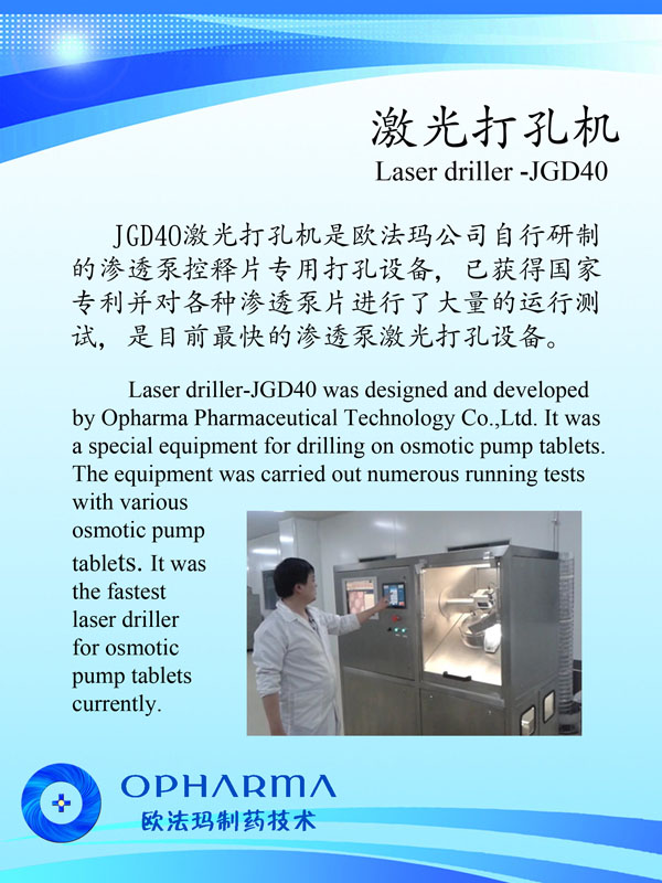 公司始建以來(lái),以前瞻的科學(xué)規(guī)劃,通過(guò)自主研發(fā),解決了高速激光打孔機(jī)諸多的世界難題,使之達(dá)到40片/秒以上且精確打孔的國(guó)際領(lǐng)先水平;同時(shí)開(kāi)發(fā)廢片自動(dòng)識(shí)別、剔除功能,以滿足客戶的實(shí)際所需。公司與瑞士等國(guó)家研究機(jī)構(gòu)的科技合作,以高速激光打孔機(jī)為基礎(chǔ),建設(shè)了滲透泵制劑研發(fā)和中試生產(chǎn)車(chē)間,開(kāi)發(fā)了多種藥物的滲透泵制劑,形成了從關(guān)鍵設(shè)備研制,新制劑開(kāi)發(fā)、工藝配套,到批量生產(chǎn)測(cè)試的滲透泵制劑開(kāi)發(fā)全過(guò)程技術(shù)團(tuán)隊(duì)和研究設(shè)施。公司瞄準(zhǔn)現(xiàn)代新型釋藥系統(tǒng),吸收國(guó)內(nèi)外高端人才,努力開(kāi)拓控緩釋技術(shù)、靶向給藥技術(shù)及智能給藥技術(shù)。