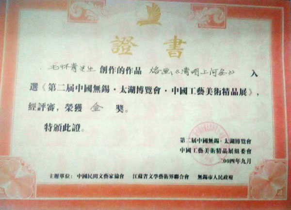 毛懷青,江蘇常州市武進(jìn)人。 中國(guó)工藝美術(shù)學(xué)會(huì)會(huì)員,常州市中國(guó)烙畫(huà)研究會(huì)副會(huì)長(zhǎng),常州市文博鑒賞協(xié)會(huì)理事,非物質(zhì)文化遺產(chǎn)烙畫(huà)傳承人。高級(jí)工藝美術(shù)師。 年輕時(shí)學(xué)習(xí)國(guó)畫(huà)、油畫(huà)中年蔓現(xiàn)掌州咯畫(huà)源遠(yuǎn)流長(zhǎng)、歷史悠久,有著其它美術(shù)門(mén)類(lèi)不具備的藝術(shù)風(fēng)格與特色?芍^是工藝美術(shù)中的一朵十分亮麗的藝術(shù)奇葩,是我民族先人給我們留下的一份不可多得十分珍貴的一份文化遺產(chǎn)。為弘揚(yáng)與發(fā)展這份優(yōu)秀文化遺產(chǎn),我從此下定決心研究烙畫(huà),愿付出一份力量為振興烙畫(huà)事業(yè)做出貢獻(xiàn)。至今已潛心研究幾十年,取得了可喜的成績(jī),被業(yè)界公認(rèn),社會(huì)關(guān)注與認(rèn)可。有“江南烙畫(huà)第一筆”之美譽(yù)。 近年來(lái),創(chuàng)作的烙畫(huà)作品分別獲得過(guò)全國(guó)、省市級(jí)的金、銀、銅獎(jiǎng)多次。中央電視臺(tái)曾兩次播放過(guò)本人的烙畫(huà)作品,江蘇電視臺(tái)、常州電視臺(tái)也曾多次播放過(guò)本人的作品與烙畫(huà)藝術(shù)生涯,揚(yáng)子晚報(bào)、常州日?qǐng)?bào)、常州晚報(bào)也曾多次報(bào)導(dǎo)過(guò)本人的烙畫(huà)作品,出版物有三種版本都能查閱到介紹本的烙畫(huà)從藝生涯與藝術(shù)業(yè)績(jī)。