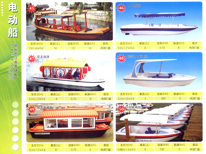隨著人民生活的提高和水上旅游業(yè)的不斷發(fā)展,原有的游艇已遠(yuǎn)不能滿足人民群眾不斷提高的需求。為適應(yīng)水上旅游業(yè)市場的變 化,我廠開發(fā)研制了符合中國國情、具有民族特色的仿古畫舫游艇及國際最新流行款式一城市旅游休閑觀光艇。特別近兩年又開發(fā)了一批精品畫舫船投放市場之后深受景區(qū)的歡迎。今年我廠又開發(fā)了適用少數(shù)民族的“風(fēng)雨橋”、“寨門”畫舫艇。在湖南、廣西、云南、貴州深受愛戴。此艇別具風(fēng)格,民族風(fēng)情特別濃厚。侗鄉(xiāng)一號計劃在2006年5月1日投放在貴州黎平侗鄉(xiāng)風(fēng)景區(qū)八舟河景區(qū)使有(風(fēng)序號)。我廠歡迎用戶來圖加工,來廠考察訂貨,畫舫艇款式多多,終有一款適合你。歡迎來電來函垂詢。索樣即寄。誠心銷售、人情化服務(wù)、企業(yè)文化、精品畫舫。