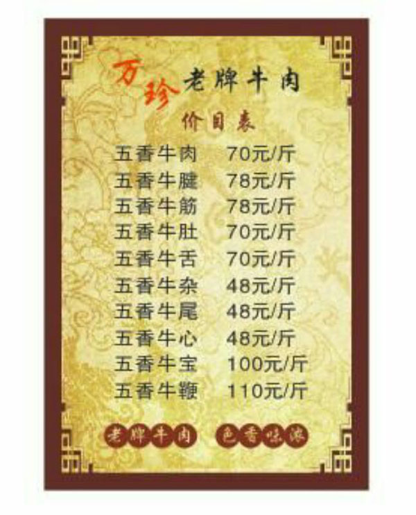 老牌牛肉創(chuàng)始人徐德洪始于1935年在常州東大街八仙浴室門口,以挑擔(dān)擺攤賣牛肉為生,1952年移至縣直街開設(shè)了徐德洪牛肉店。1958年公私合營改名為四時(shí)興牛肉店。文化大革命后又改名為立新牛肉店,1979年退休。他一生加工經(jīng)常五香牛肉,選料精良,工藝講究,配方獨(dú)到,牛肉色香味濃,味道純正鮮美,百吃不厭。長期以來,深得廣大顧客的一致好評(píng)和喜愛,成為常州城家喻戶曉的老字號(hào)。 徐萬珍乃徐德洪之女,傳承父業(yè),秉承父親精益求精的優(yōu)良傳統(tǒng),于1997年在同濟(jì)橋開設(shè)了萬珍老牌牛肉店,經(jīng)營至今二十載,嚴(yán)格選料把關(guān),遵循傳統(tǒng)加工工藝,不加工任何添加劑,繼承和保留了老牌牛肉的傳統(tǒng)特色和傳統(tǒng)老味道,色香味濃,原汁原味,得到了更多新老顧客的青睞。