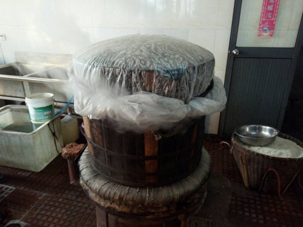 第一步:蒸糯米飯,老徐先用煤爐將水燒開,再將洗凈泡好的糯米放入一只大木桶中,放在爐子上蒸。除此以外,老徐還要不斷攪拌,保證糯米受熱均勻,直至散發(fā)出水蒸氣。為了保證米飯溫度,老徐特地用塑料薄膜將木桶封住,并用皮筋加固。蒸糯米飯,大約需要半個(gè)多小時(shí)。