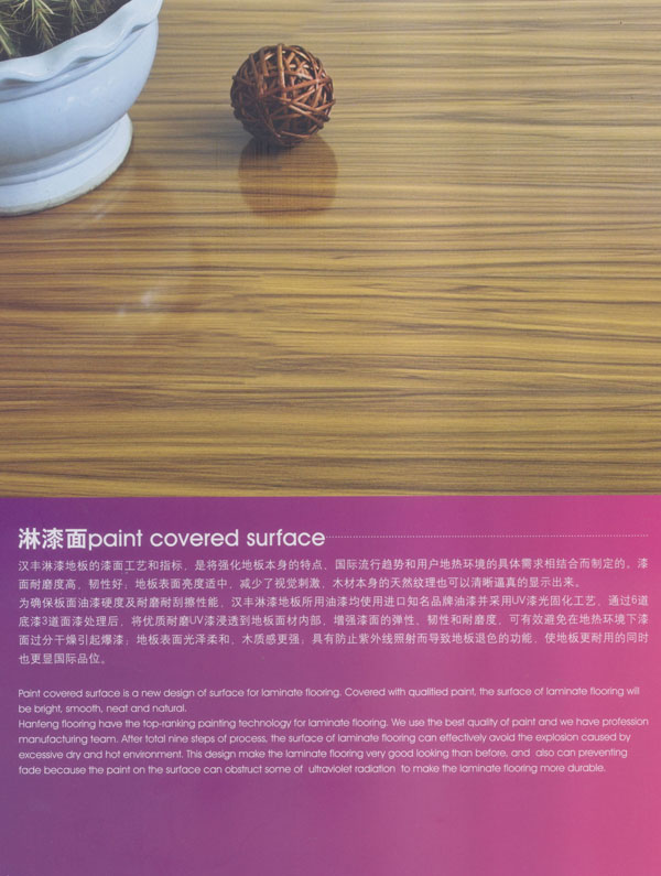 漢豐地板以奉獻生活中最完美的地板為發(fā)展目標,時尚流行的設計風格和多樣化的產(chǎn)品類型,贏得了市場的廣泛贊譽和肯定。產(chǎn)品嚴格按照歐洲標準檢測強化木地板的各項性能指標.達到百分百的國際技術(shù)標準,確保了每一塊地板都有著上乘品質(zhì),是綠色環(huán)保的好地板。并先后通過了Isc)9001國際質(zhì)量管理體系認證,IS014001國際環(huán)境管理體系認證.中國環(huán)境標志產(chǎn)品認證,深得用戶的一致好評,是寫字樓、商場、大型超市、學校、建筑樓宇、娛樂場所、家用私宅等鋪裝的首選地板。