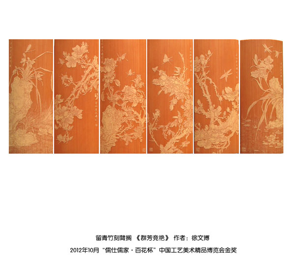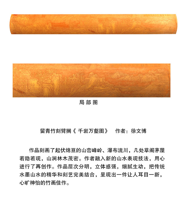 徐博(藝名文博),1973年生,江蘇武進人,江蘇省省名人,高級工藝美術(shù)師,常州市留青竹刻非遺傳承人,常州工藝美術(shù)家協(xié)會理事,被譽為當今中國最具創(chuàng)新意識的新銳竹刻家代表,多次獲得國家工藝美術(shù)大獎?釔哿羟嘀窨痰男煳牟┵p竹為樂,以竹詠志,借竹抒懷,悉心探索留青竹刻的藝術(shù)表現(xiàn)。在中國工藝美術(shù)大師蕭劍波的精心指導下,開創(chuàng)留青水墨山水之技法,更好的體現(xiàn)了竹刻淡雅清秀的藝術(shù)風格,并不斷汲取書畫、攝影、雕塑等藝術(shù)精華,不斷滋養(yǎng)藝術(shù)情趣,提升擴展胸襟人格的同時也逐步形成了其形神兼?zhèn),虛實相生,氣韻生動的藝術(shù)特點,作品為眾多的國內(nèi)外收藏家珍藏。