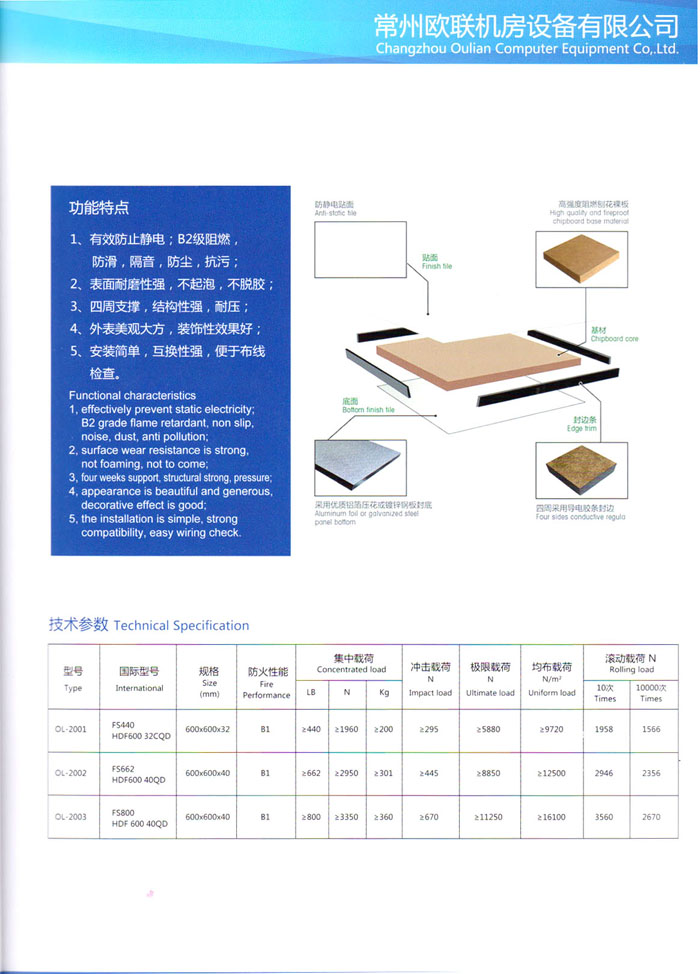 防靜電高架活動(dòng)地板、全鋼地板、陶瓷地板是計(jì)算機(jī)行業(yè)發(fā)展起來(lái)的新型鋪地材料,隔離了潮氣、靜電灰塵,最重要的是解決了綜合布線問(wèn)題,無(wú)需預(yù)埋管線,可隨時(shí)拆卸、搬移,保證了資訊設(shè)備完整的優(yōu)點(diǎn),適應(yīng)了智能化樓宇中信息自動(dòng)化技術(shù)對(duì)所處環(huán)境的特定要求,避免了廣大客戶的雙重投資,使現(xiàn)代化辦公程度更加高效,辦公場(chǎng)所更加舒適。 “歐聯(lián)”系列全鋼地板,符合國(guó)家安全要求,種類完備多樣,其中防靜電陶瓷地板、硫酸鈣地板等除具有普通瓷質(zhì)的裝飾和實(shí)用性外,其耐磨、防水、防火功能優(yōu)于其它同類產(chǎn)品,防靜電系列地板,能切合不同客戶的要求,其靈活的配置,深受客戶歡迎,不同材質(zhì)的地板結(jié)構(gòu)使設(shè)計(jì)師的設(shè)計(jì)空間比傳統(tǒng)的更加廣闊自由和善變。 公司大力發(fā)展國(guó)內(nèi)外銷售業(yè)務(wù),多次中標(biāo)國(guó)內(nèi)重點(diǎn)工程 ,例:哈爾濱醫(yī)科大學(xué)、山東大學(xué)、上海普通機(jī)場(chǎng)等。 公司將一如既往開(kāi)發(fā)和制造一流的產(chǎn)品,愿與廣大有識(shí)之士合作發(fā)展,共創(chuàng)美好未來(lái)。