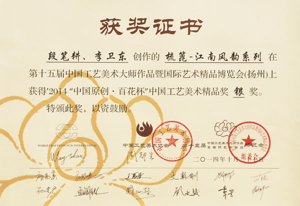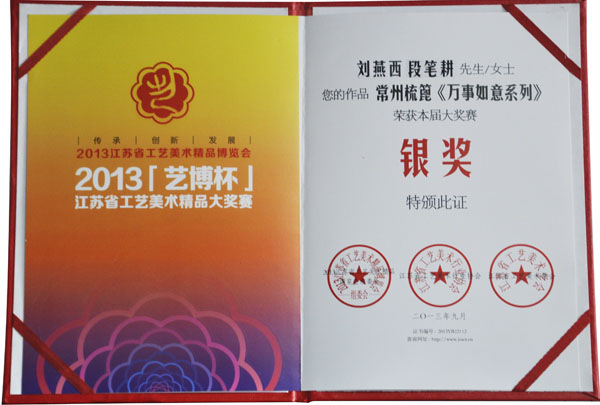 公司榮譽(yù)介紹: “2009年常州市旅游商品創(chuàng)新設(shè)計(jì)大賽”,“覽盡千荷”綠檀雕刻梳榮獲三等獎(jiǎng); “2011年常州市旅游商品創(chuàng)新設(shè)計(jì)大賽”,“彩印工藝梳-我們的年代(80)”榮獲二等獎(jiǎng)。 “2011年中國(guó)包裝創(chuàng)意設(shè)計(jì)大賽“,虞美人彩印梳篦系列包裝獲得一等獎(jiǎng); “2011年中國(guó)包裝創(chuàng)意設(shè)計(jì)大賽”,虞美人筷子系列包裝獲得三等獎(jiǎng); “2011創(chuàng)意中國(guó).第五屆設(shè)計(jì)藝術(shù)大獎(jiǎng)賽”,虞美人系列包裝獲得三等獎(jiǎng); “2011首屆中國(guó)(無錫)國(guó)際文化藝術(shù)博覽會(huì)”,漆藝對(duì)梳《喜玫瑰》獲得“藝博杯“銅獎(jiǎng)。 “第十三屆中國(guó)工藝美術(shù)大師作品暨國(guó)際藝術(shù)精品博覽會(huì)”, 漆藝梳《報(bào)喜鳥》榮獲2012“儒士儒家•百花杯”中國(guó)工藝美術(shù)精品獎(jiǎng)優(yōu)秀獎(jiǎng) “第十三屆中國(guó)工藝美術(shù)大師作品暨國(guó)際藝術(shù)精品博覽會(huì)”, 虞美人《渾然天成》榮獲2012“儒士儒家•百花杯”中國(guó)工藝美術(shù)精品獎(jiǎng)金獎(jiǎng) “2012江蘇省工藝美術(shù)精品大獎(jiǎng)賽”,虞美人《S型梳》喜獲“藝博杯”銀獎(jiǎng) “第十四屆中國(guó)工藝美術(shù)大師作品暨國(guó)際藝術(shù)精品博覽會(huì)”, 虞美人工藝梳《新型十二星座梳》榮獲2013“國(guó)信•百花杯”中國(guó)工藝美術(shù)精品獎(jiǎng)優(yōu)秀獎(jiǎng) “2013【藝博杯】江蘇省工藝美術(shù)精品大獎(jiǎng)賽”,虞美人《萬事如意系列》喜獲“藝博杯”銀獎(jiǎng) “2013江蘇省工藝美術(shù)新人新作成果展作品大獎(jiǎng)賽”,虞美人《壺(福)的藝術(shù)》喜獲“藝博杯”入圍獎(jiǎng) 2013年度江蘇省“蘇商領(lǐng)袖峰會(huì)”,常州市卓尚飾品有限公司榮獲最具成長(zhǎng)性企業(yè)獎(jiǎng) 常州市卓尚飾品(虞美人)有限公司總經(jīng)理李衛(wèi)東榮獲“常州創(chuàng)意產(chǎn)業(yè)協(xié)會(huì)2013年底慈善獎(jiǎng)榮譽(yù)” 常州市卓尚飾品有限公司榮獲薛家鎮(zhèn)人民政府2013年度“創(chuàng)新創(chuàng)優(yōu)”獎(jiǎng) 常州市卓尚飾品有限公司榮獲薛家鎮(zhèn)人民政府2013年度“銷售業(yè)績(jī)”獎(jiǎng) 2014中國(guó)(深圳)國(guó)際文化產(chǎn)業(yè)博覽交易會(huì),劉燕西、李衛(wèi)東、段筆耕<十二星座系列>獲得“中國(guó)工藝美術(shù)文化創(chuàng)意獎(jiǎng)”銀獎(jiǎng) 2014中國(guó)(深圳)國(guó)際文化產(chǎn)業(yè)博覽交易會(huì),徐德鴻、李衛(wèi)東、段筆耕《漆彩人生系列》獲得“中國(guó)工藝美術(shù)文化創(chuàng)意獎(jiǎng)”銅獎(jiǎng) 文化創(chuàng)意大獎(jiǎng)賽“紫金獎(jiǎng)” ,有余(魚)系列梳篦產(chǎn)品獲得了優(yōu)秀獎(jiǎng) 2014吟飛杯首屆常州文化創(chuàng)意和設(shè)計(jì)大賽,虞美人有余(魚)系列梳篦產(chǎn)品榮獲優(yōu)秀設(shè)計(jì)獎(jiǎng) 2014吟飛杯首屆常州文化創(chuàng)意和設(shè)計(jì)大賽,虞美人“云,月”系列梳篦產(chǎn)品榮獲優(yōu)秀設(shè)計(jì)獎(jiǎng) 2014藝博杯江蘇省工藝美術(shù)精品大獎(jiǎng)賽,虞美人《梳篦:酒醉的探戈》喜獲銀獎(jiǎng) 2014“中國(guó)原創(chuàng)•百花杯”中國(guó)工藝美術(shù)精品大獎(jiǎng)賽,虞美人《梳篦-江南風(fēng)韻系列》喜獲銀獎(jiǎng) 常州市卓尚飾品有限公司獲“2014年常州市電子商務(wù)協(xié)會(huì)2014年度優(yōu)秀會(huì)員單位” 2014“虞美人”成為常州市知名商標(biāo)。