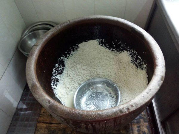 第二步:冷卻降溫,糯米蒸熟后,用冷水淋沐,直至糯米飯溫度降到35℃左右。要知道這個溫度非常關鍵,太冷了會影響之后酒曲發(fā)酵,溫度太高會把酒曲中的酵母殺死。不靠溫度計,老徐靠得完全是自己多年的經(jīng)驗。