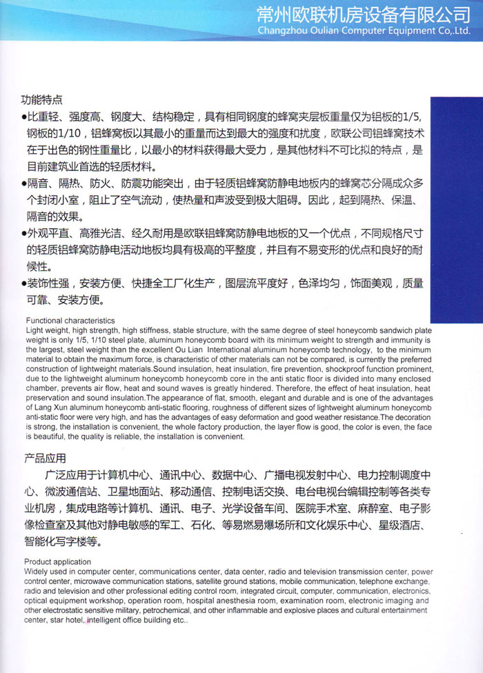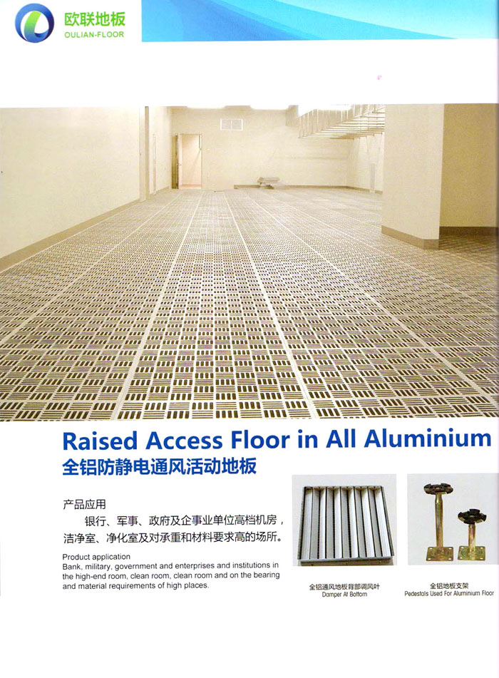 防靜電高架活動地板、全鋼地板、陶瓷地板是計(jì)算機(jī)行業(yè)發(fā)展起來的新型鋪地材料,隔離了潮氣、靜電灰塵,最重要的是解決了綜合布線問題,無需預(yù)埋管線,可隨時(shí)拆卸、搬移,保證了資訊設(shè)備完整的優(yōu)點(diǎn),適應(yīng)了智能化樓宇中信息自動化技術(shù)對所處環(huán)境的特定要求,避免了廣大客戶的雙重投資,使現(xiàn)代化辦公程度更加高效,辦公場所更加舒適。 “歐聯(lián)”系列全鋼地板,符合國家安全要求,種類完備多樣,其中防靜電陶瓷地板、硫酸鈣地板等除具有普通瓷質(zhì)的裝飾和實(shí)用性外,其耐磨、防水、防火功能優(yōu)于其它同類產(chǎn)品,防靜電系列地板,能切合不同客戶的要求,其靈活的配置,深受客戶歡迎,不同材質(zhì)的地板結(jié)構(gòu)使設(shè)計(jì)師的設(shè)計(jì)空間比傳統(tǒng)的更加廣闊自由和善變。 公司大力發(fā)展國內(nèi)外銷售業(yè)務(wù),多次中標(biāo)國內(nèi)重點(diǎn)工程 ,例:哈爾濱醫(yī)科大學(xué)、山東大學(xué)、上海普通機(jī)場等。 公司將一如既往開發(fā)和制造一流的產(chǎn)品,愿與廣大有識之士合作發(fā)展,共創(chuàng)美好未來。