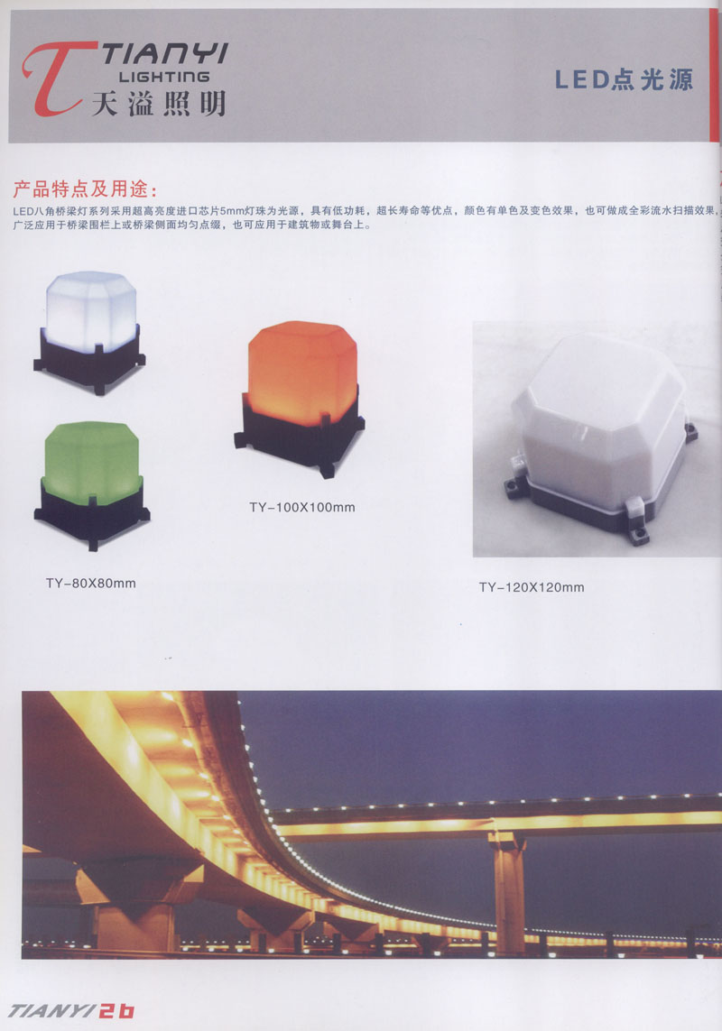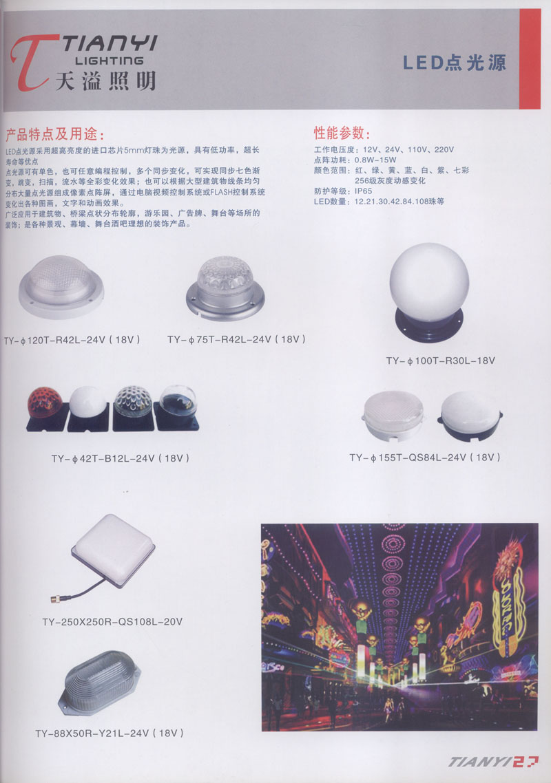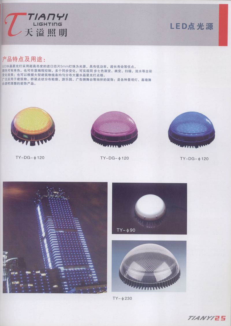 天溢照明是中國領(lǐng)先的專業(yè)從事LED廣告照明裝飾燈具設(shè)計(jì)、系統(tǒng)開發(fā)、燈具制造、工程服務(wù)一體的專業(yè)型公司,本公司產(chǎn)品已廣泛應(yīng)用于全國大多數(shù)城市夜景亮化景觀照明、酒店休閑娛樂夜場(chǎng)夢(mèng)幻燈光、戶內(nèi)外廣告宣傳、建筑及室內(nèi)照明以及家居裝飾等場(chǎng)合。 本公司產(chǎn)品涵蓋景觀裝飾照明、商用照明、居家照明、信息廣告顯示等領(lǐng)域,我們將性能可靠與適中價(jià)格的LED全系列產(chǎn)品帶到世界各個(gè)、角落。